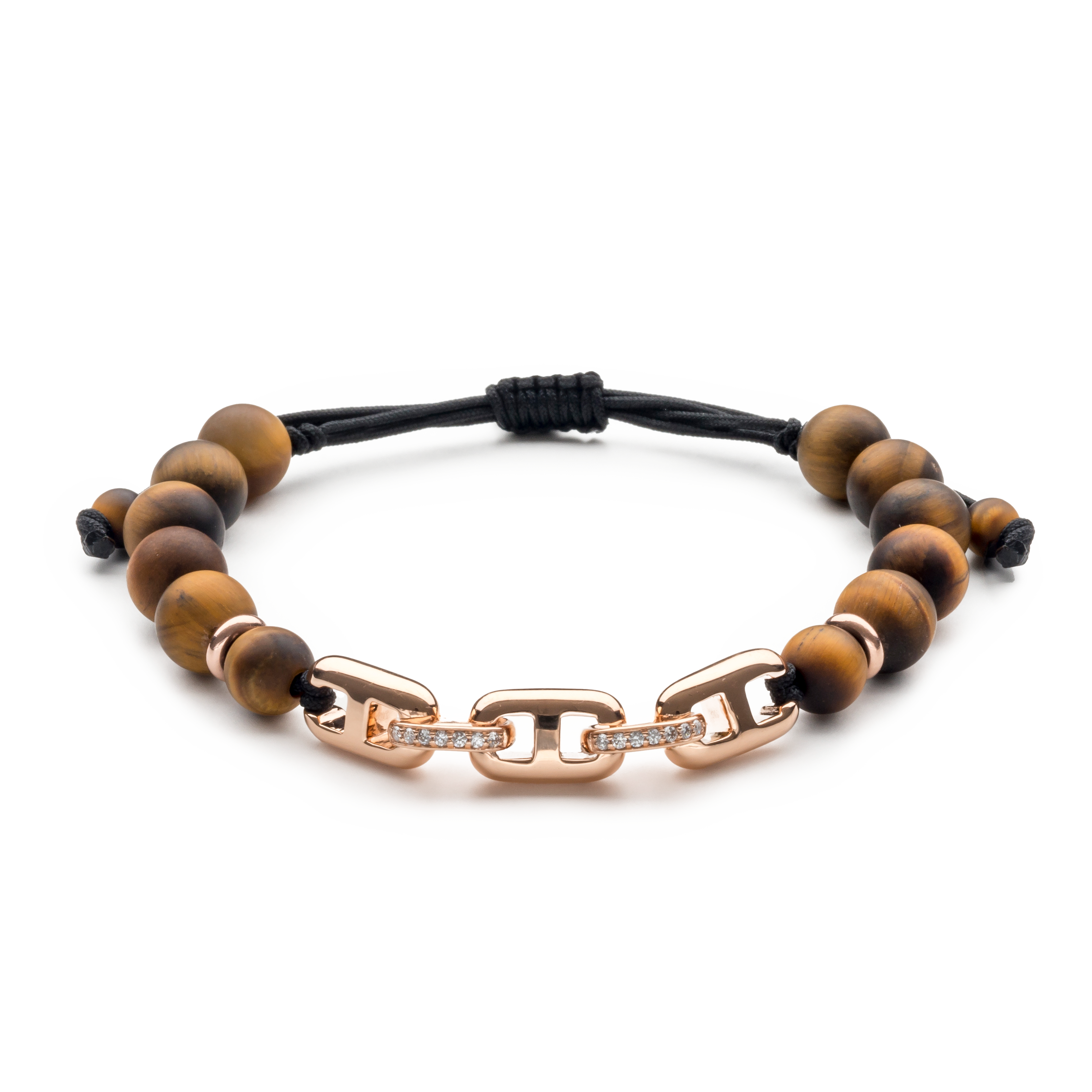 Pulsera oro rosa 18K, ojo de tigre, 14 piedras, triple eslabón diamantes, Cordón de nailon ajustable de 15cm a 25cm