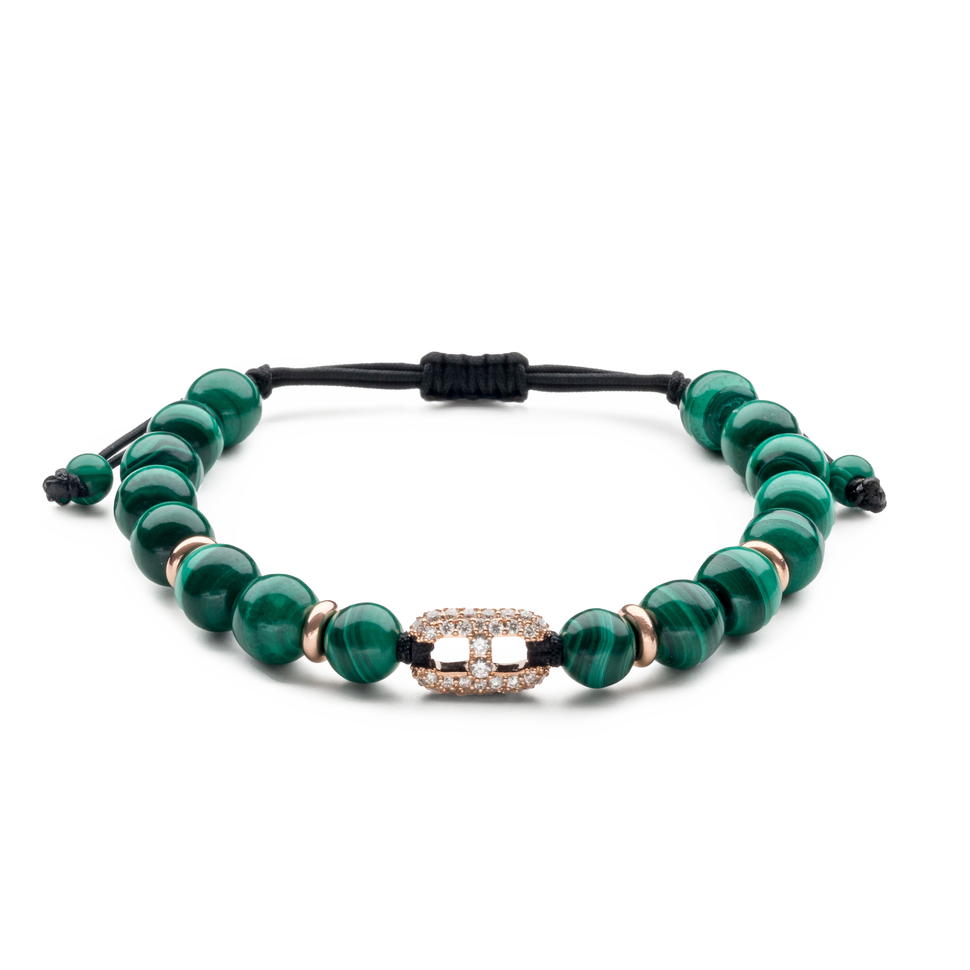 Pulsera oro rosa 18K, malaquita, 32 piedras, eslabón grande diamantes, Cordón de nailon ajustable de 15cm a 25cm