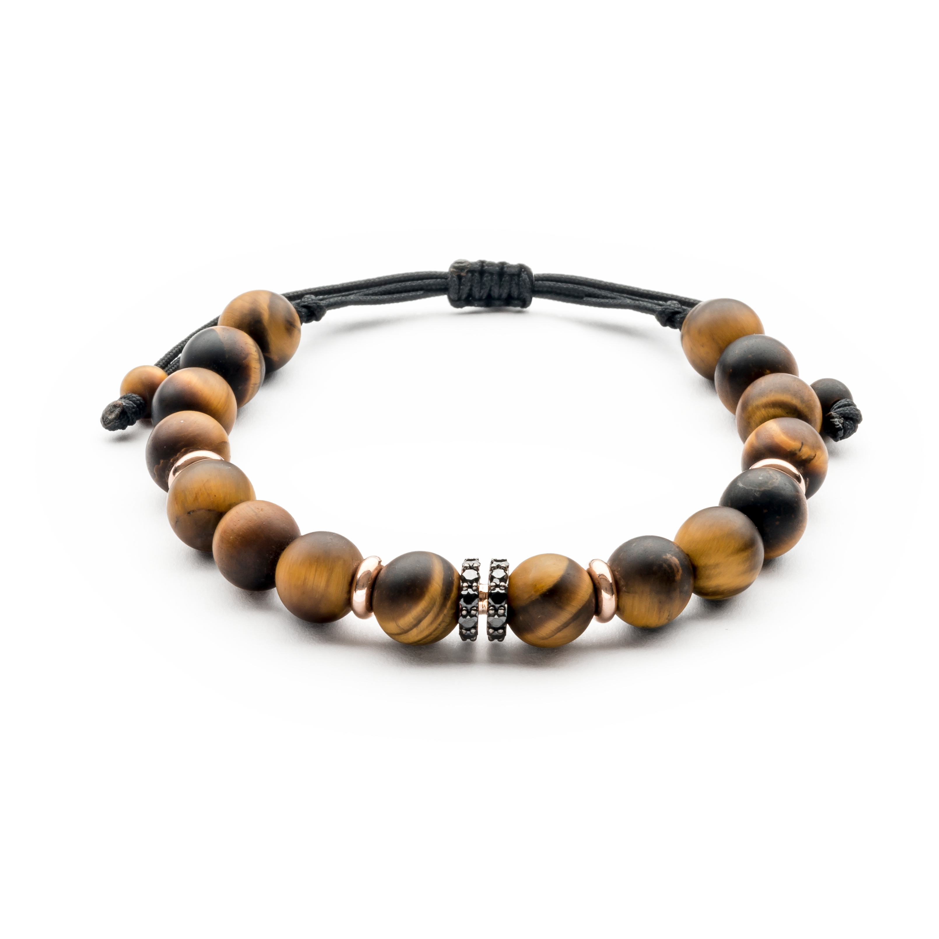 Pulsera oro rosa 18K, ojo de tigre, 20 piedras, doble rueda diamantes negros, Cordón de nailon ajustable de 15cm a 25cm