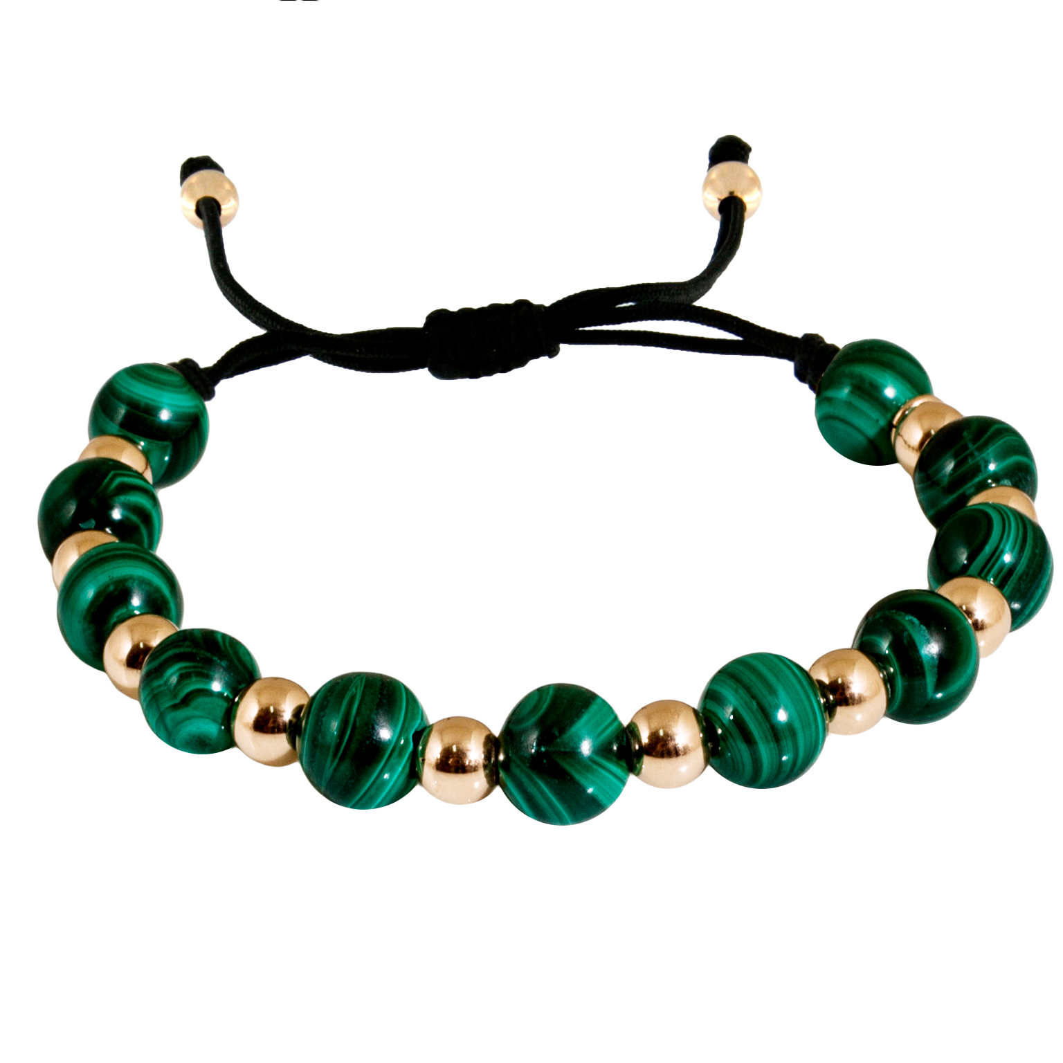 Pulsera oro rosa 18K, malaquita, bola 5mm, Cordón de nailon ajustable de 15cm a 25cm