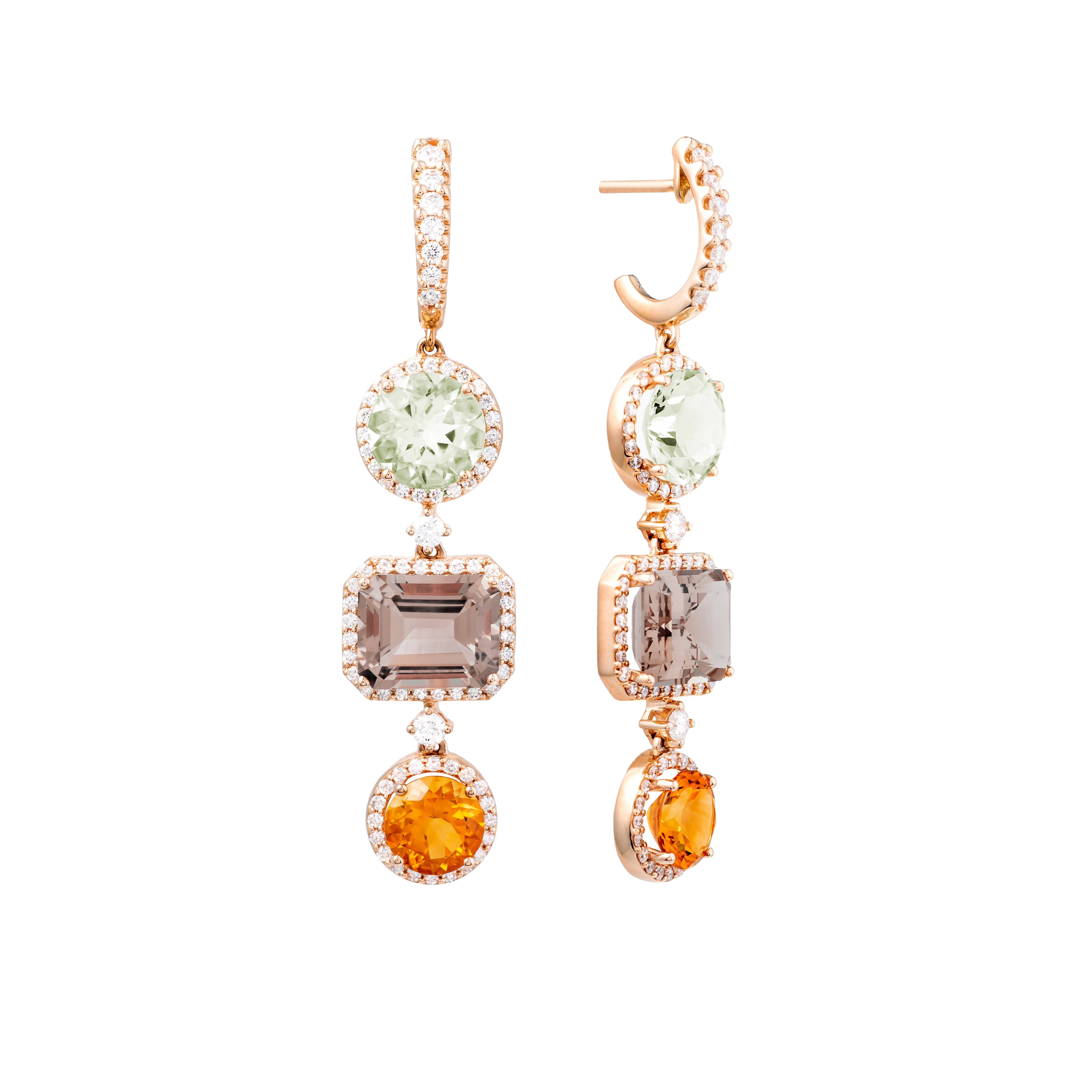 Pendientes oro rosa 18K, diamante color GH, claridad SI 1.29 ct, prasiolita, citrino y cuarzo fume, 160 piedras, cierre presión