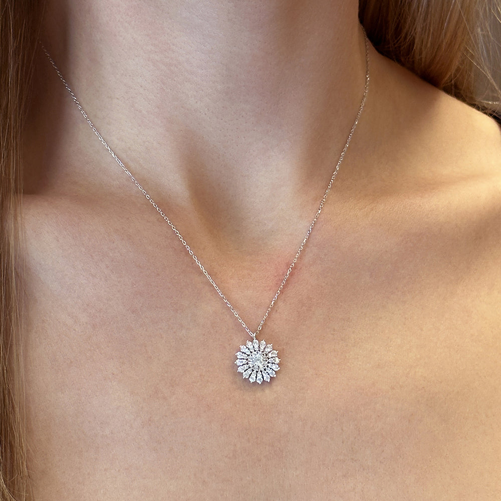 Colgante oro blanco 18K, diamante color GH, claridad SI 0.77 ct, 41 piedras, cadena forzatina 42cm cierre mosquetón