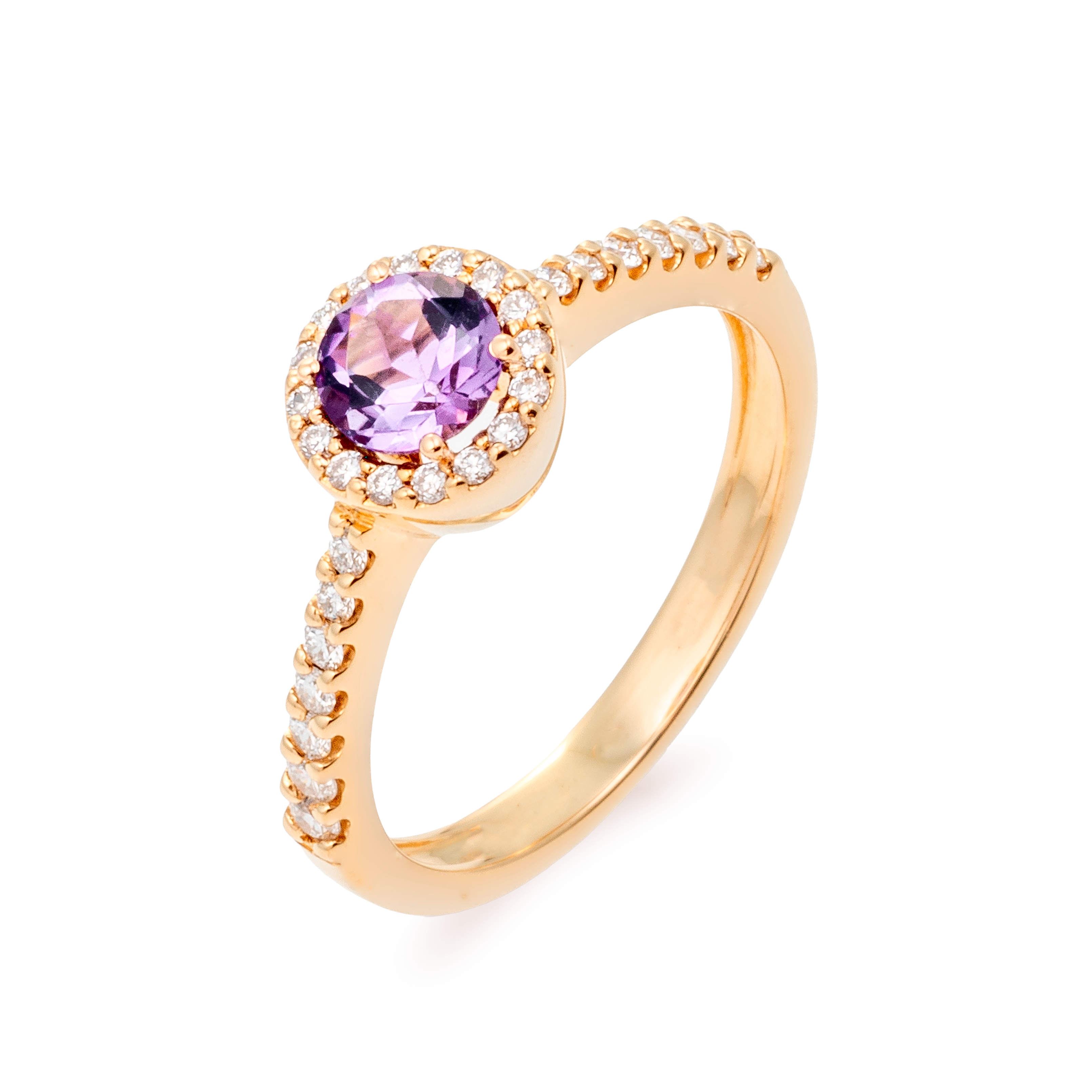 Sortija oro rosa 18K, diamante color GH, claridad SI 0.29 ct, amatista, 30 piedras