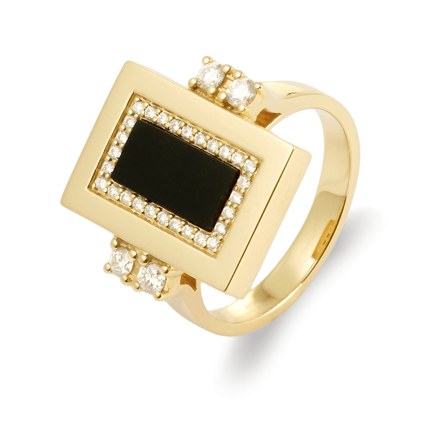 Sortija oro amarillo 18K, diamante color GH, claridad SI 0.34 ct, onix, 32 piedras