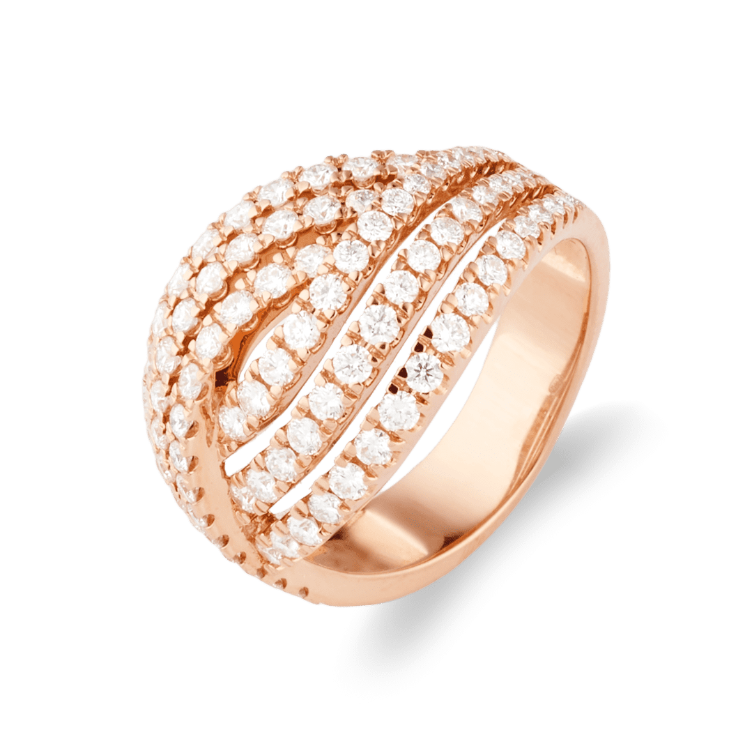 Sortija oro rosa 18K, diamante color GH, claridad SI 1.44 ct, 96 piedras