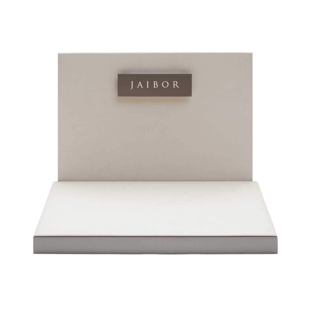 Panel trasero bajo de 25 cm de alto × 35 cm de ancho, terciopelo beige con placa magnética del logotipo Jaibor, y panel base de 36 cm de ancho × 36 cm de fondo, terciopelo beige