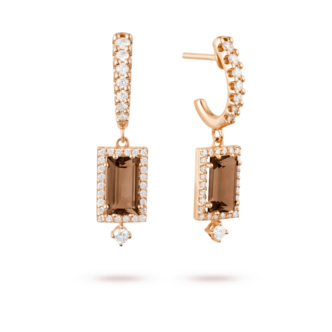 Pendientes oro rosa 18K, diamante color GH, claridad SI 0.62 ct, cuarzo fume, cierre presión
