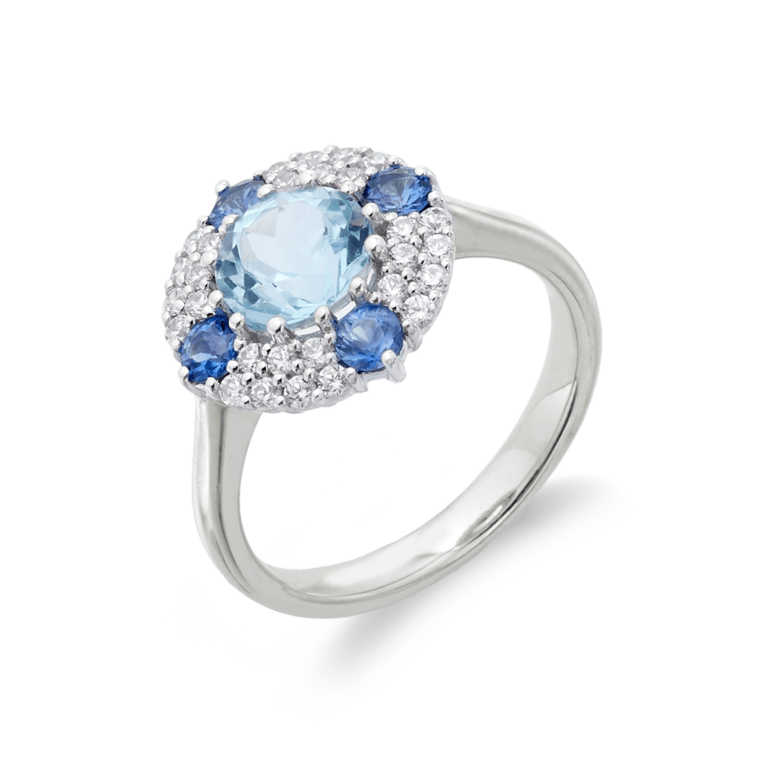 Sortija oro blanco 18K, diamante color GH, claridad SI 0.31 ct, zafiro, 28 piedras