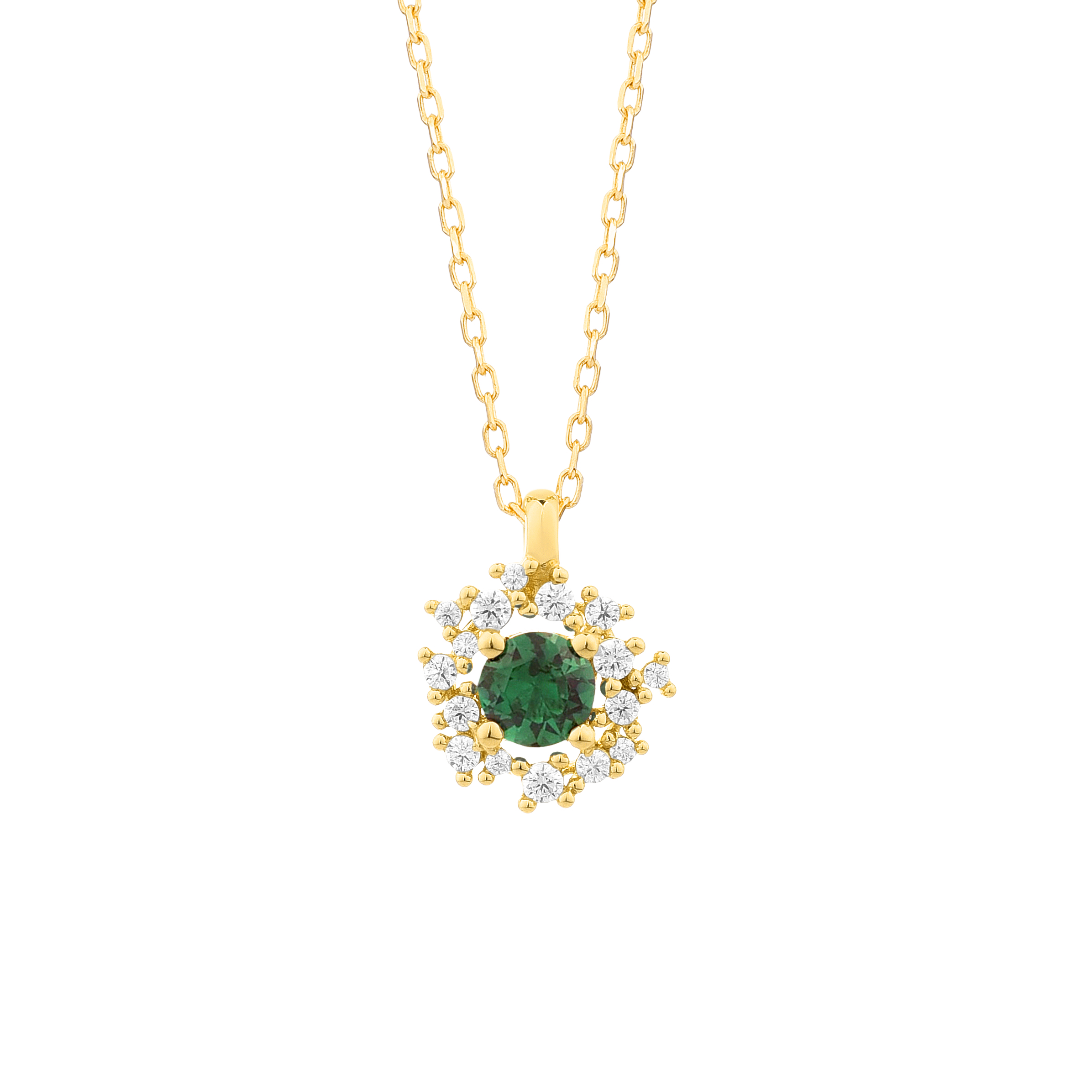 Colgante oro amarillo 18K, diamante color GH, claridad SI 0.13 ct, esmeralda, 16 piedras, cadena rolo 42cm cierre mosqueton