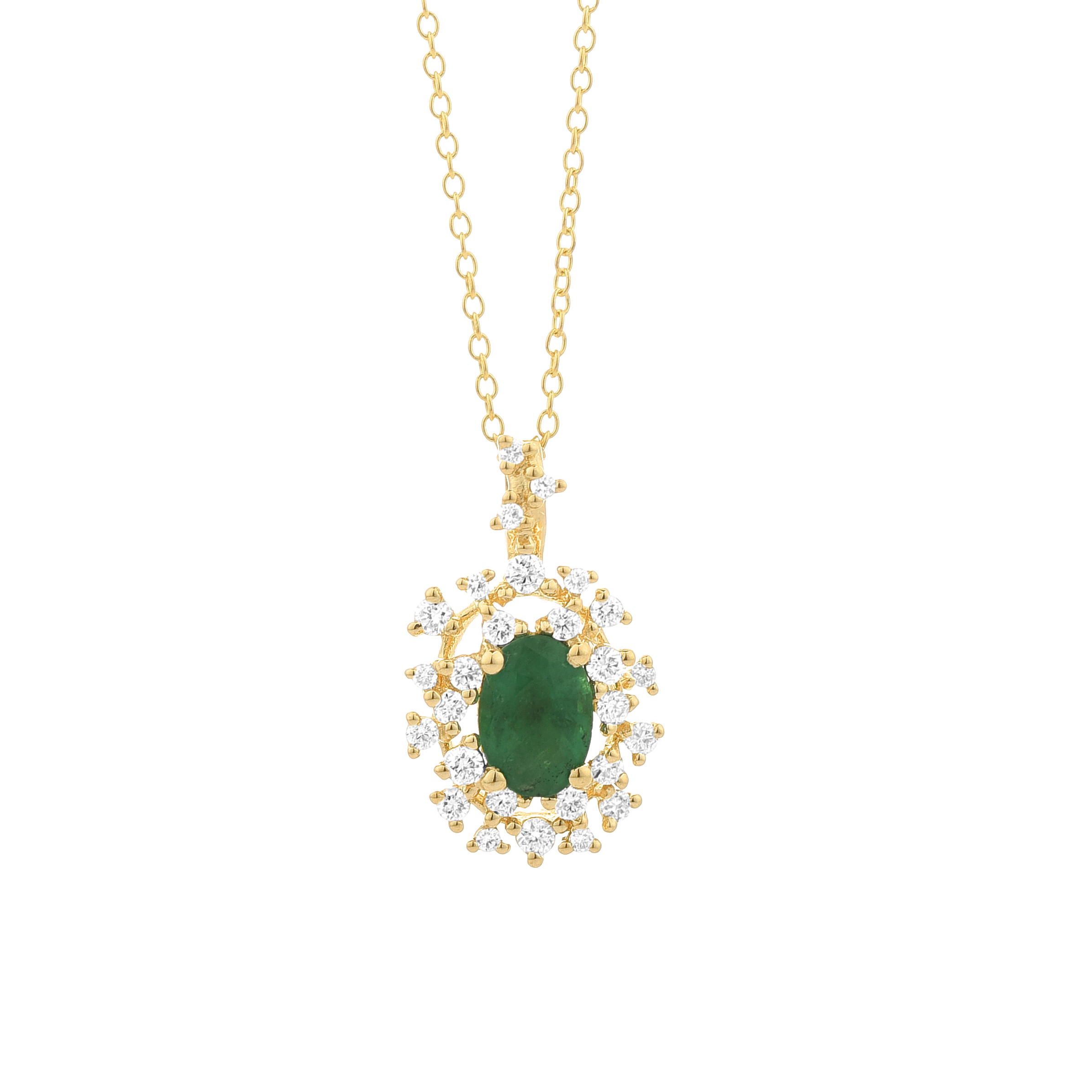 Colgante oro amarillo 18K, diamante color GH, claridad SI 0.19 ct, esmeralda, 27 piedras, cadena 42cm cierre mosqueton
