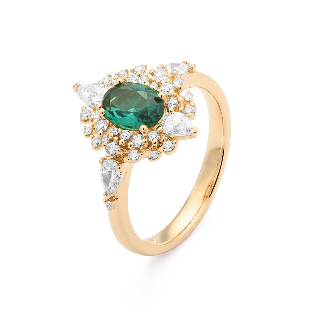 Armonía de tradición y modernidad: los halos clásicos se combinan con la elegancia contemporánea con diamantes dispuestos artísticamente alrededor de gemas centrales vibrantes.
