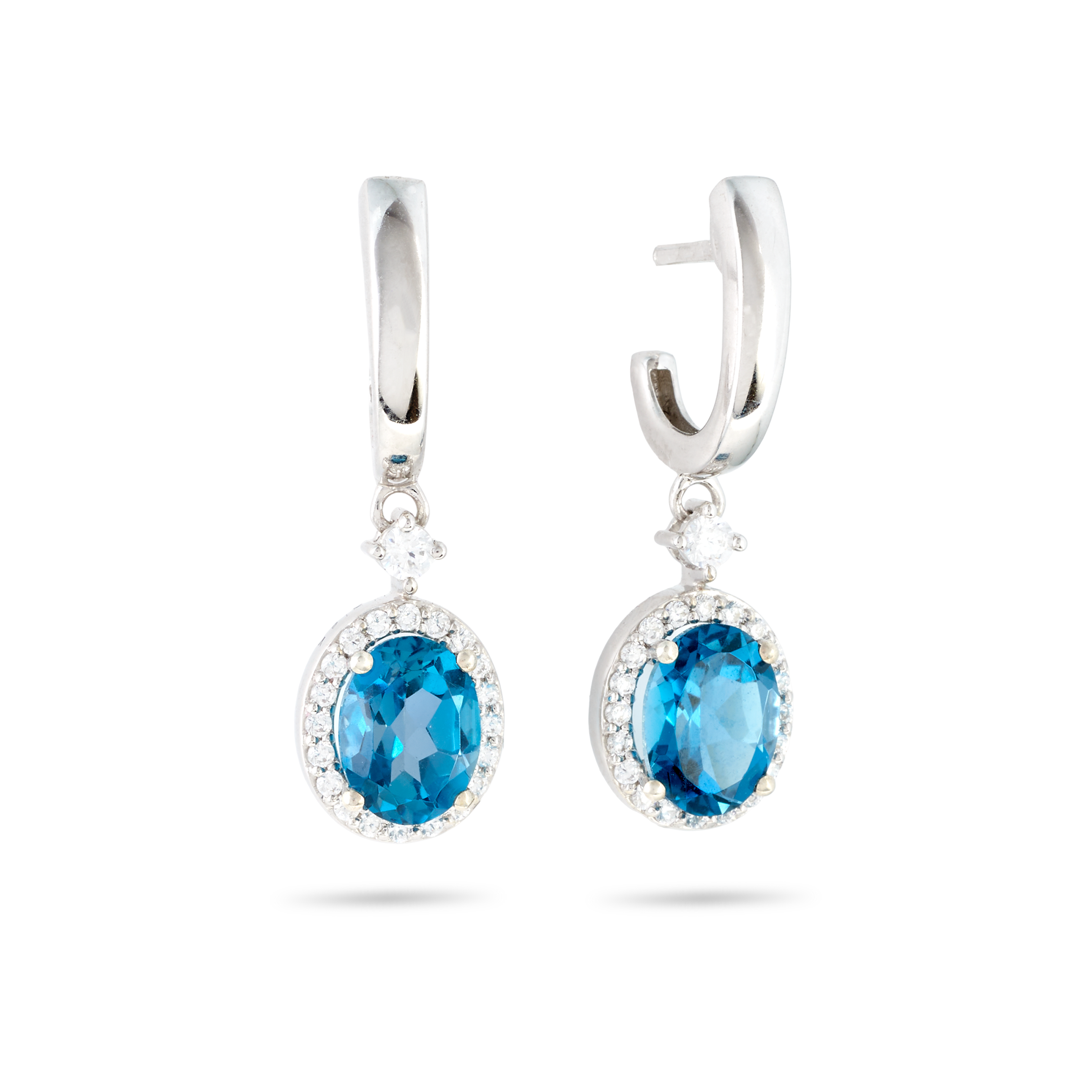 Pendientes oro blanco 18K, diamante color GH, claridad SI 0.36 ct, london blue, 42 piedras, cierre presión