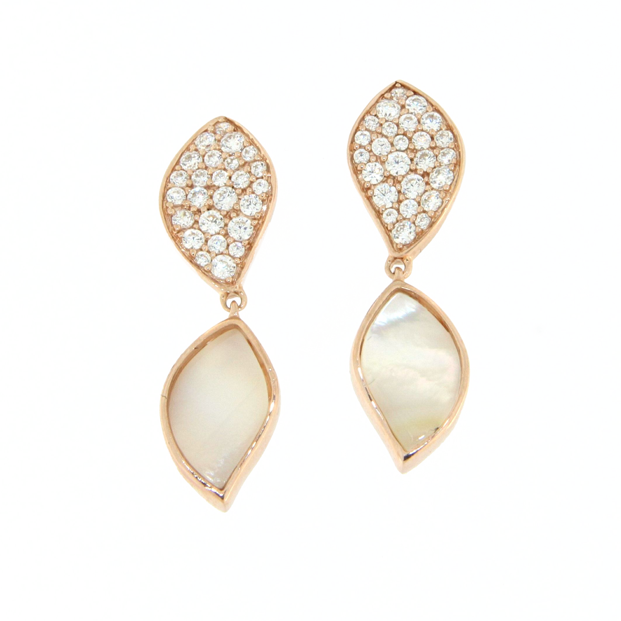Pendientes oro rosa 18K, diamante color GH, claridad SI 0.61 ct, madre perla, 50 piedras, cierre presión