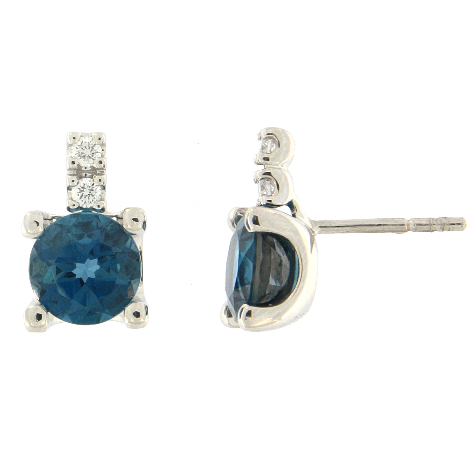 Pendientes oro blanco 18K, diamante color GH, claridad SI 0.16 ct, london blue, 4 piedras, cierre presión