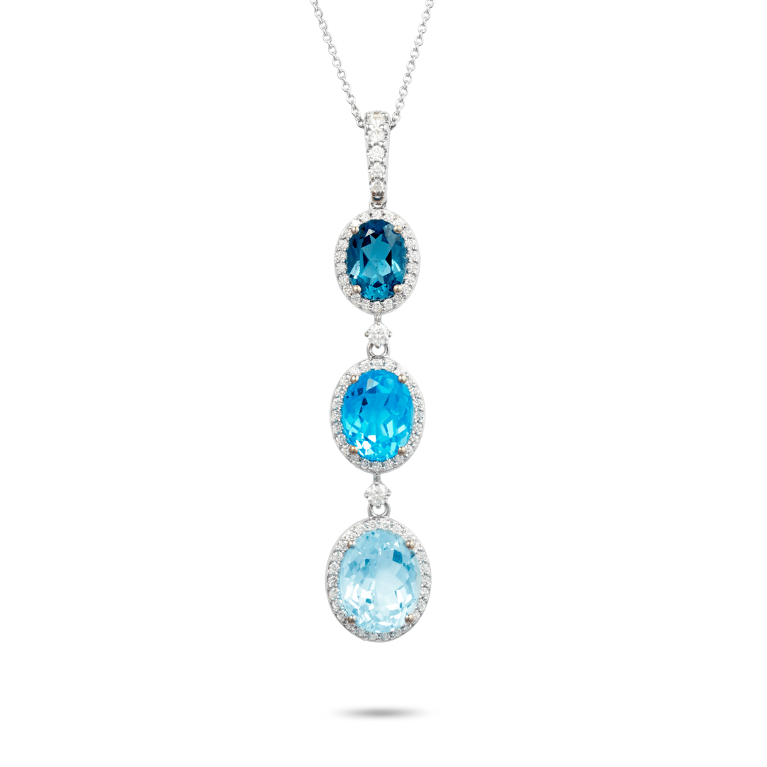 Colgante oro blanco 18K, diamante color GH, claridad SI 0.50 ct, london blue y topacio sky, 80 piedras, cadena forzatina 42cm cierre mosquetón