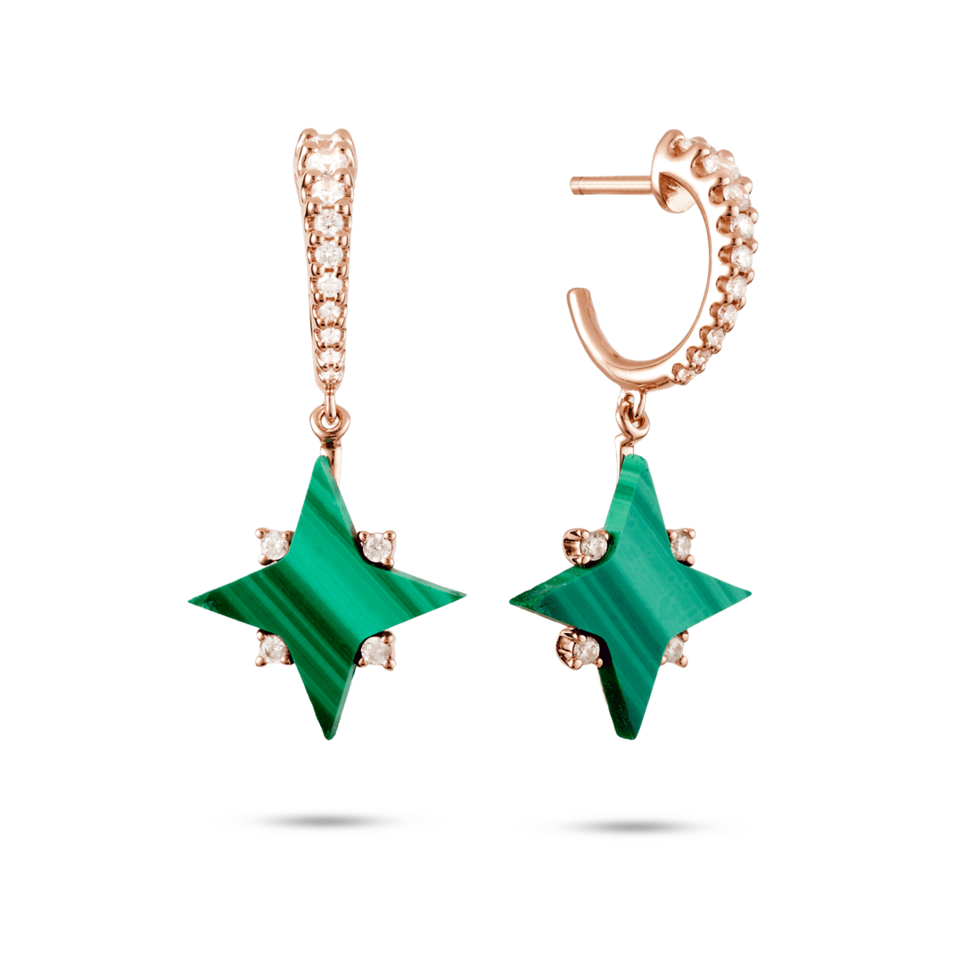 Pendientes oro rosa 18K, diamante color GH, claridad SI 0.38 ct, malaquita, 30 piedras, cierre presión