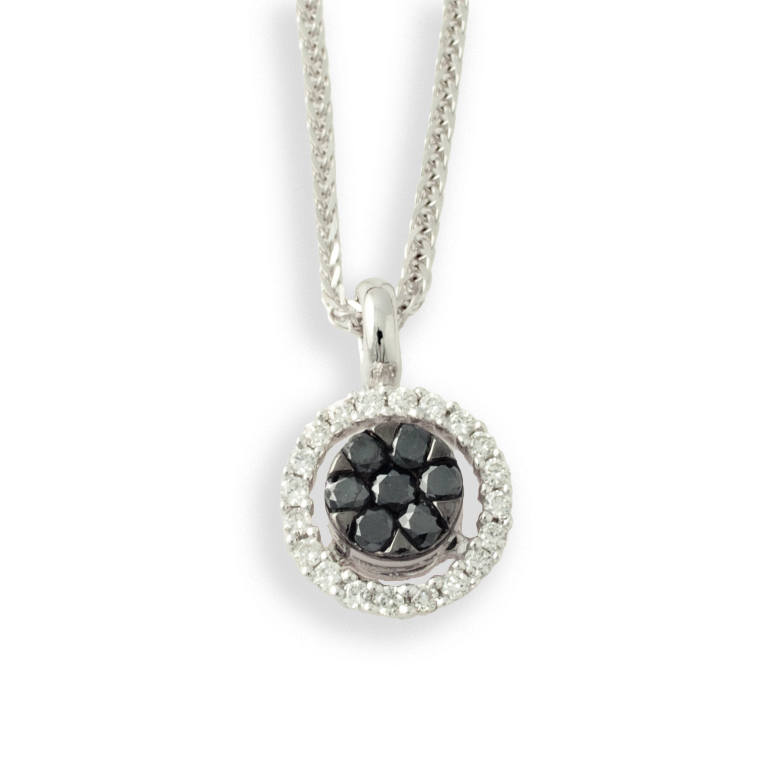 Colgante oro blanco 18K, diamante color GH, claridad SI 0.12 ct y diamante negro 0.20 ct, 27 piedras, cadena espiga 40cm cierre mosquetón