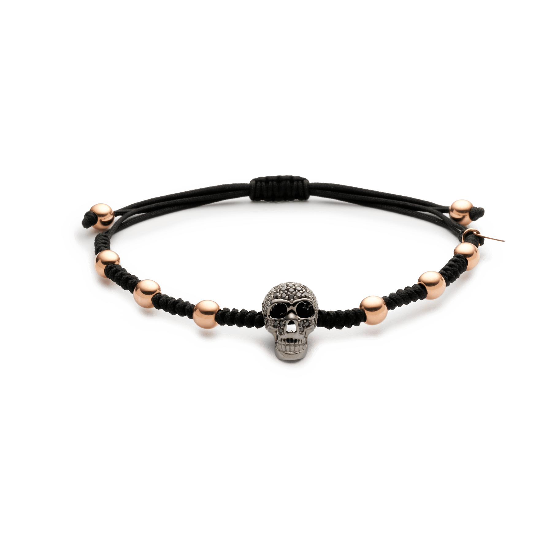 Pulsera oro rosa 18K, diamante negro 0.70 ct, 109 piedras, bola 5mm, Cordón de nailon ajustable de 15cm a 25cm