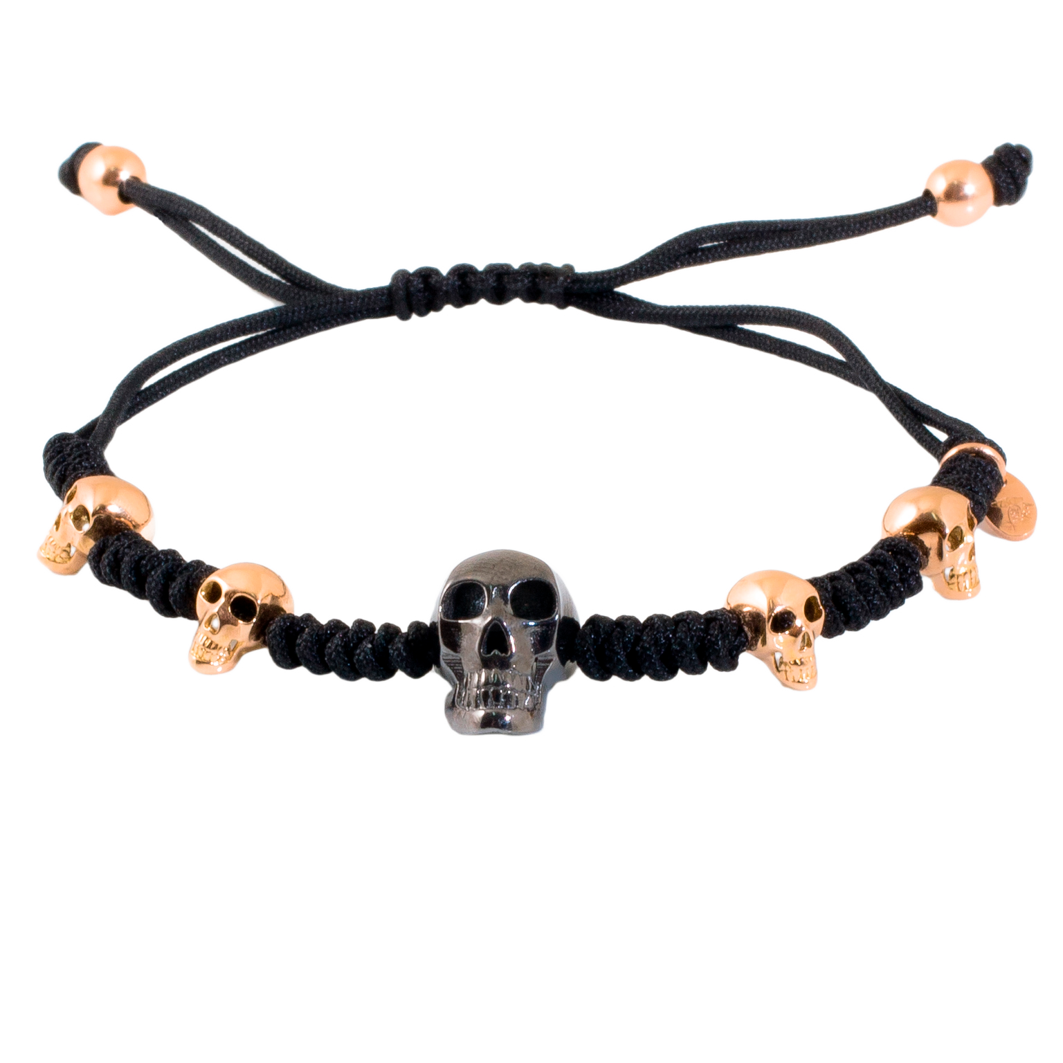 Pulsera oro rosa 18K, calavera bola 5mm, Cordón de nailon ajustable de 15cm a 25cm