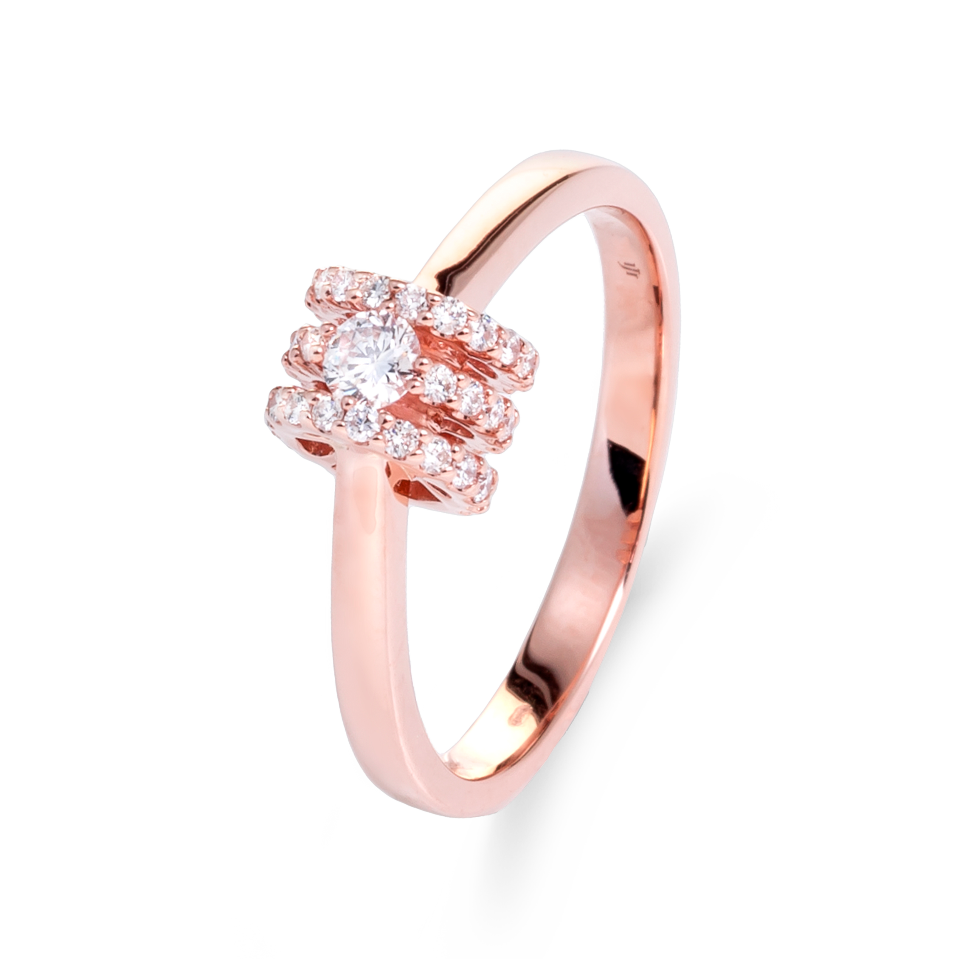 Sortija oro rosa 18K, diamante color GH, claridad SI 0.31 ct, 41 piedras