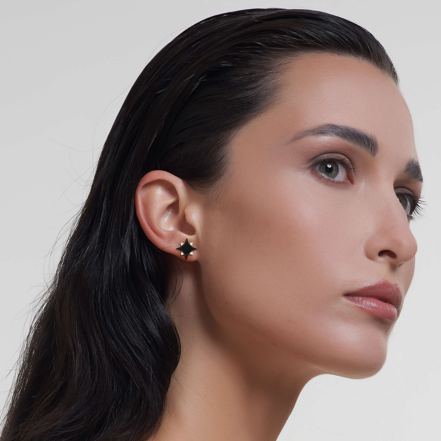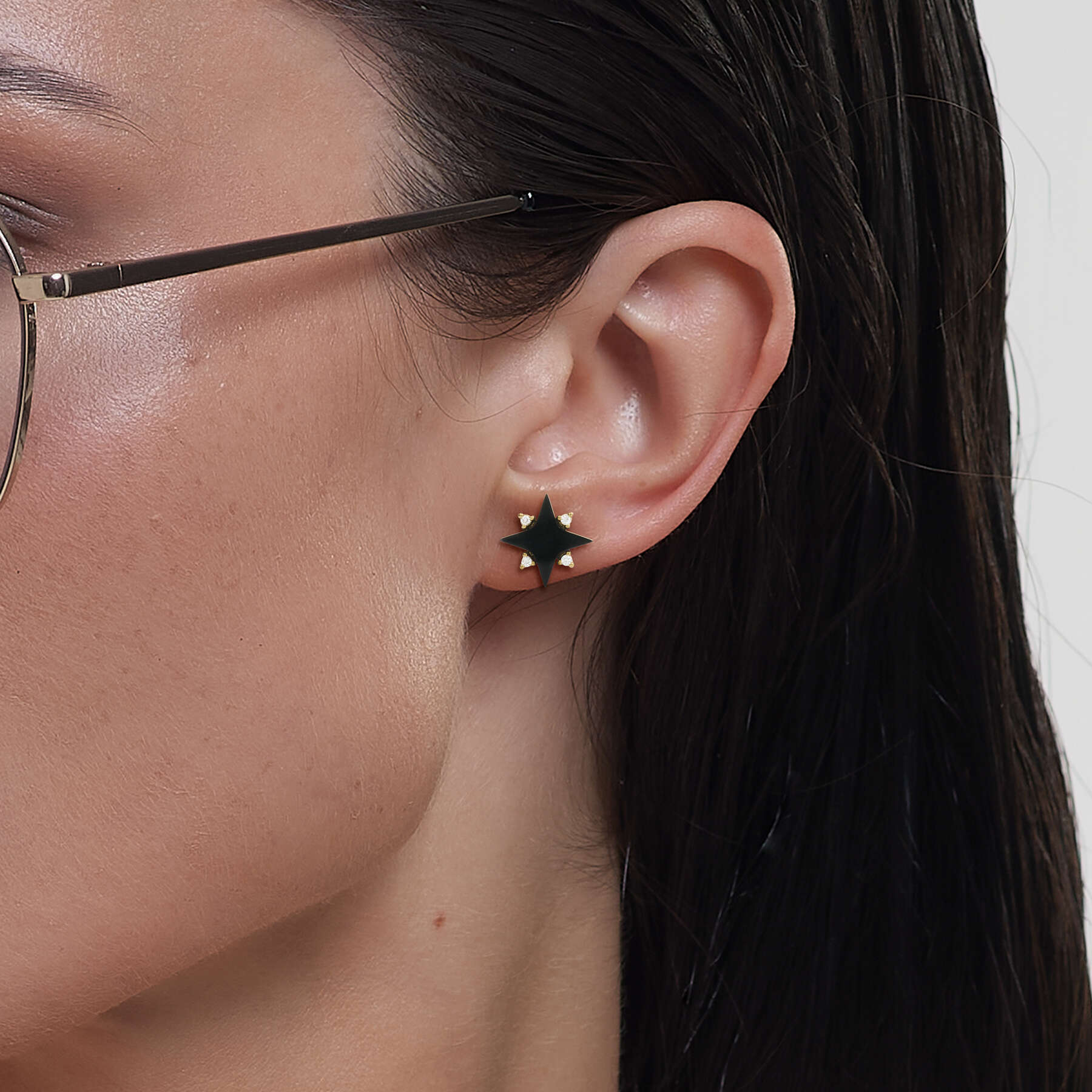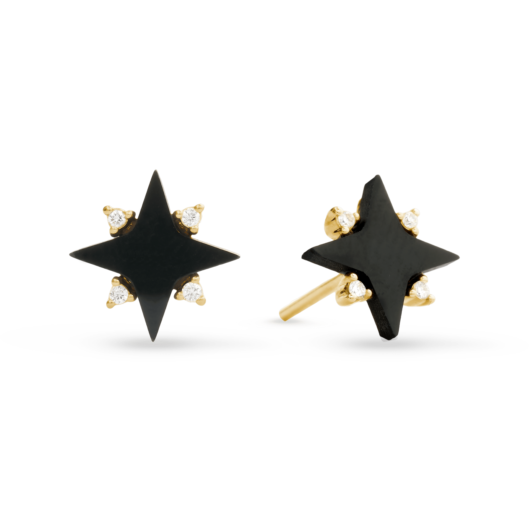 Pendientes oro amarillo 18K, diamante color GH, claridad SI 0.10 ct, onix, 8 piedras, cierre presión