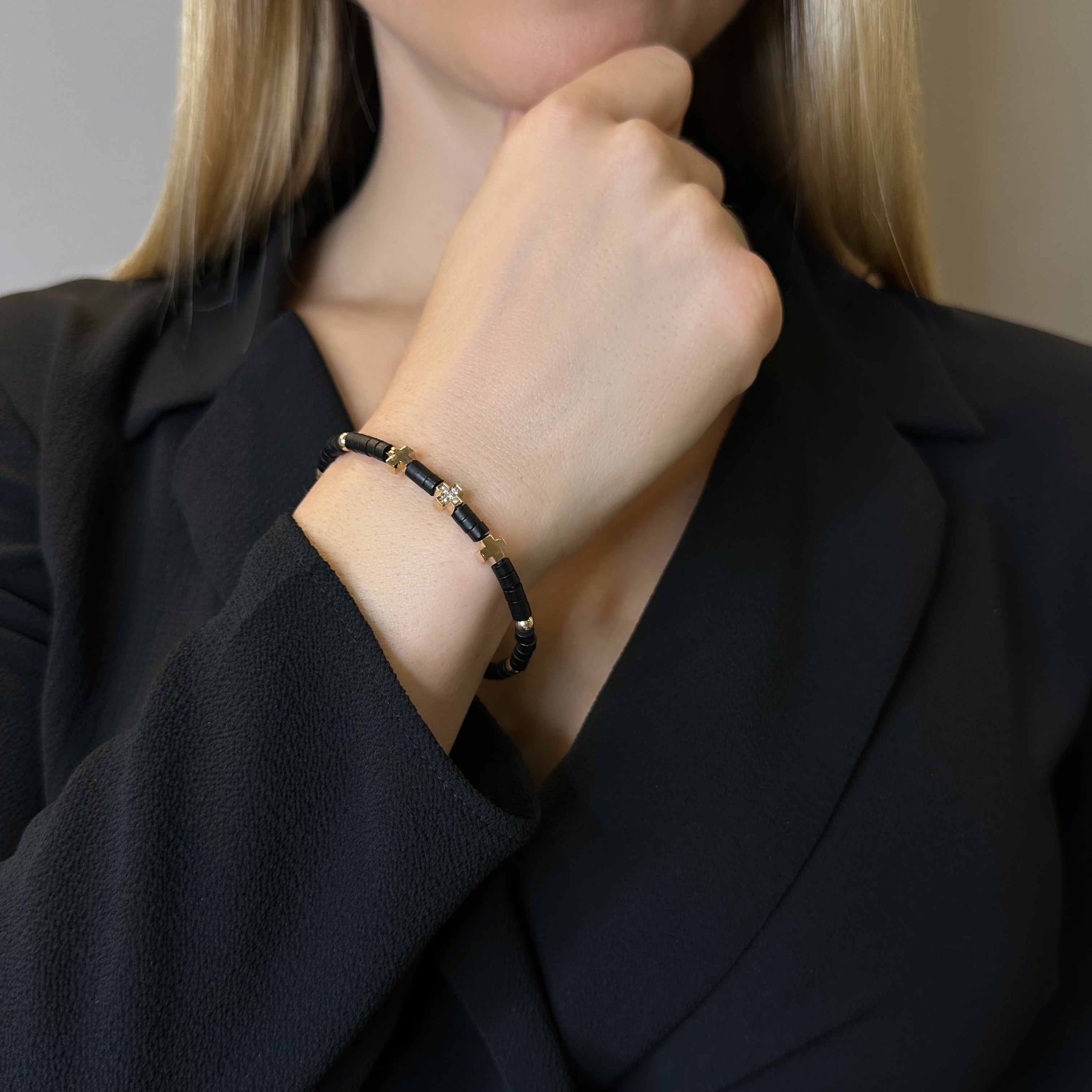 Pulsera oro rosa 18K, diamante color GH, claridad SI 0.05 ct, onix, 5 piedras, titanio talla M (16.0cm) bola 4mm