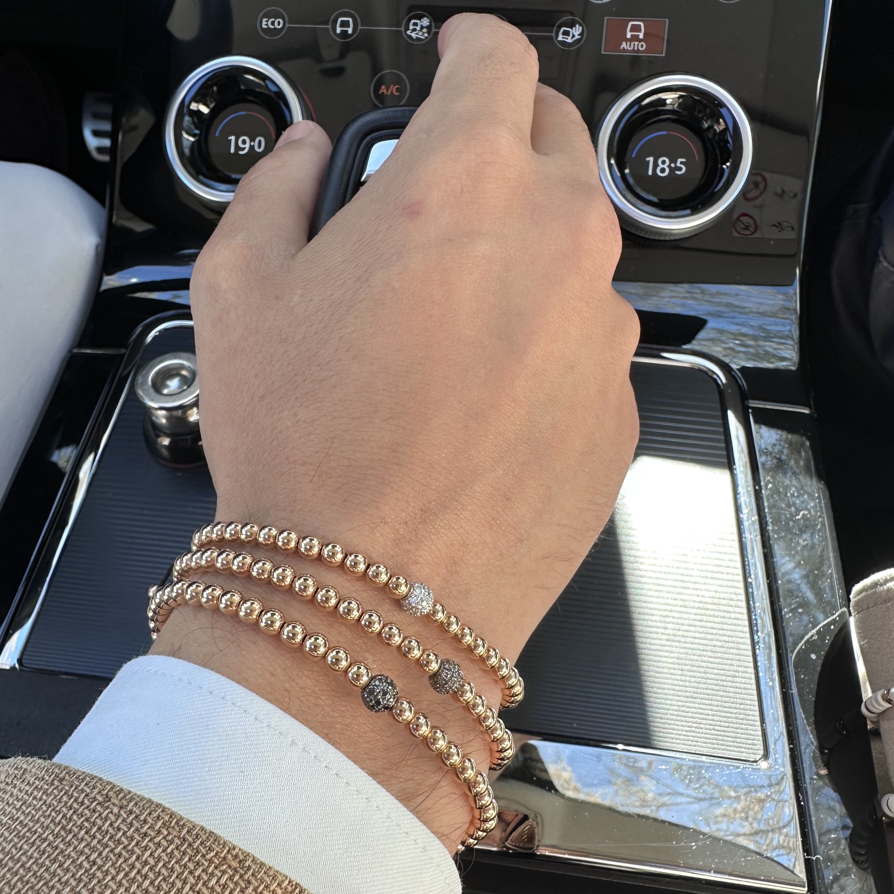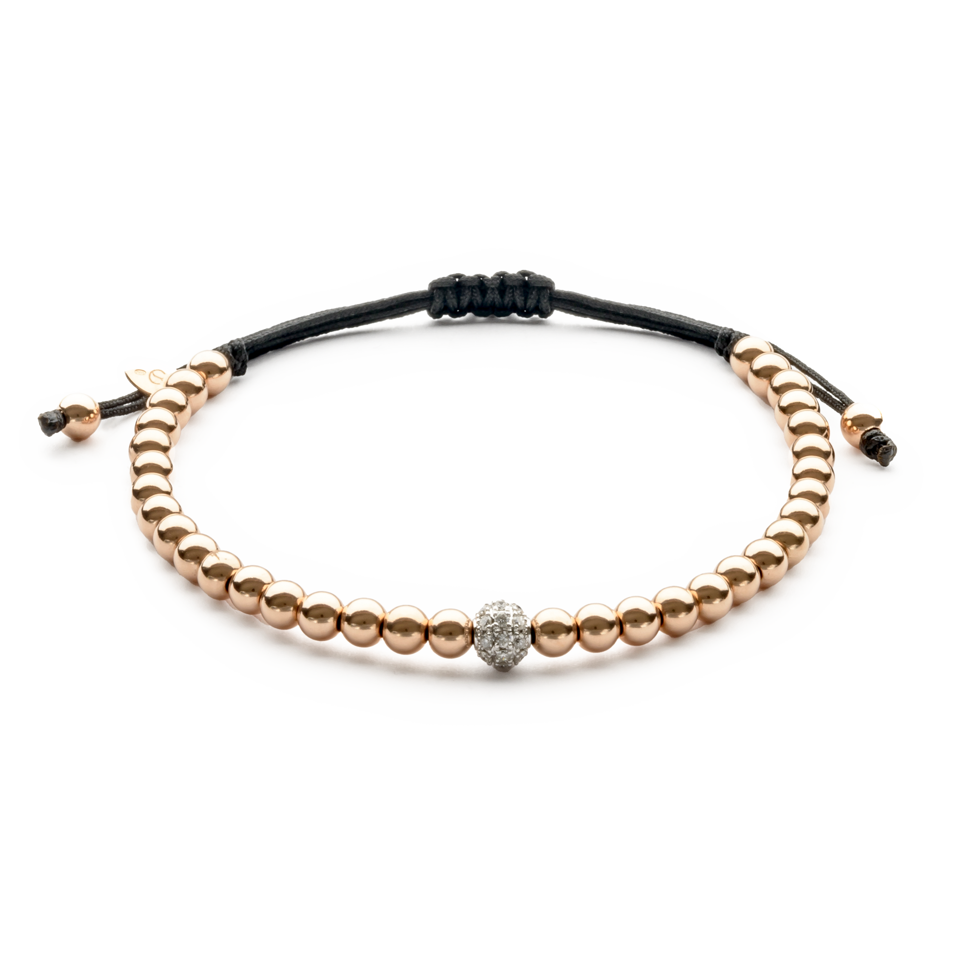 Pulsera oro rosa 18K, 26 piedras, bola pavé 6mm diamantes bola 4mm, Cordón de nailon ajustable de 15cm a 25cm