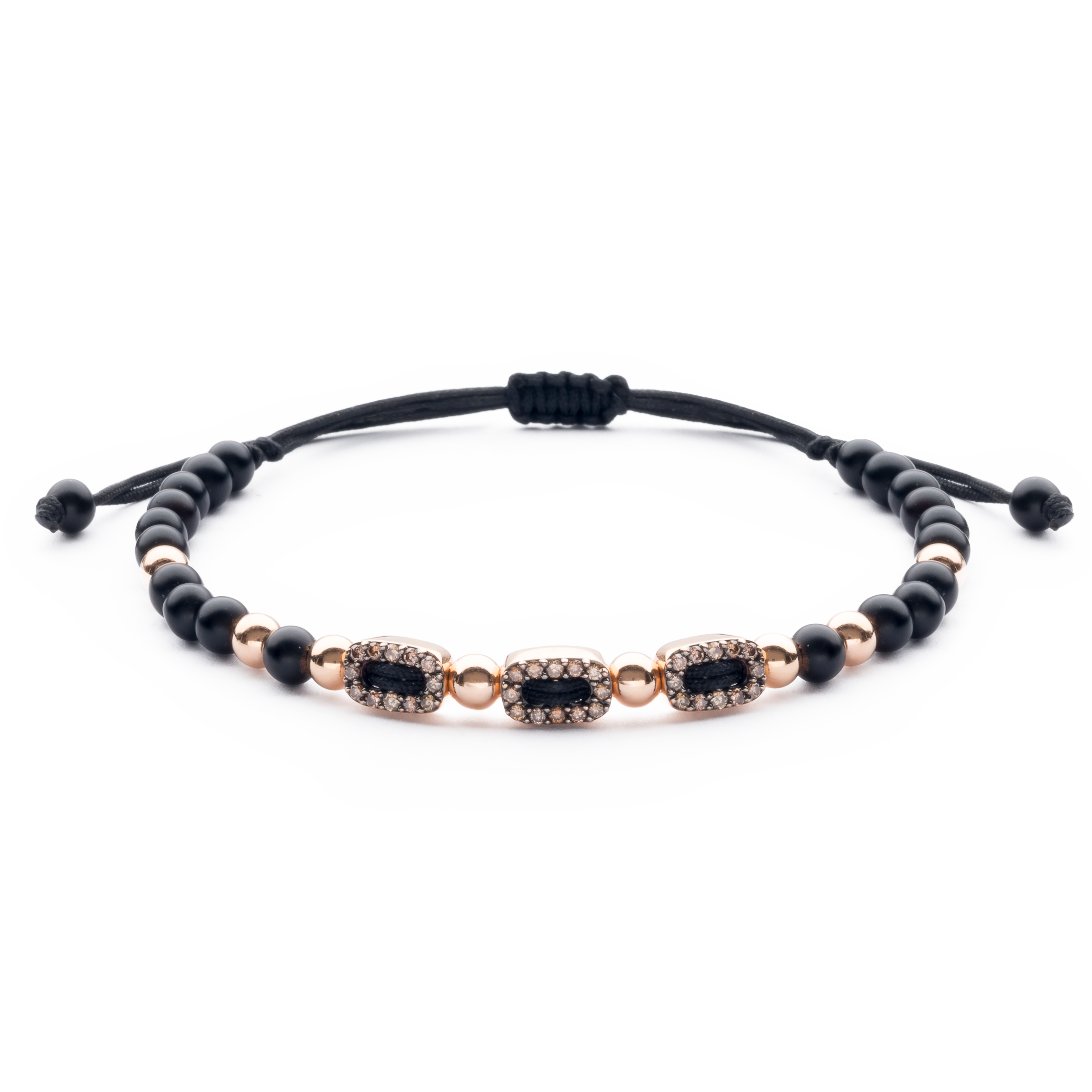 Pulsera oro rosa 18K, onix, 36 piedras, eslabón diamantes brown bola 4mm, Cordón de nailon ajustable de 15cm a 25cm