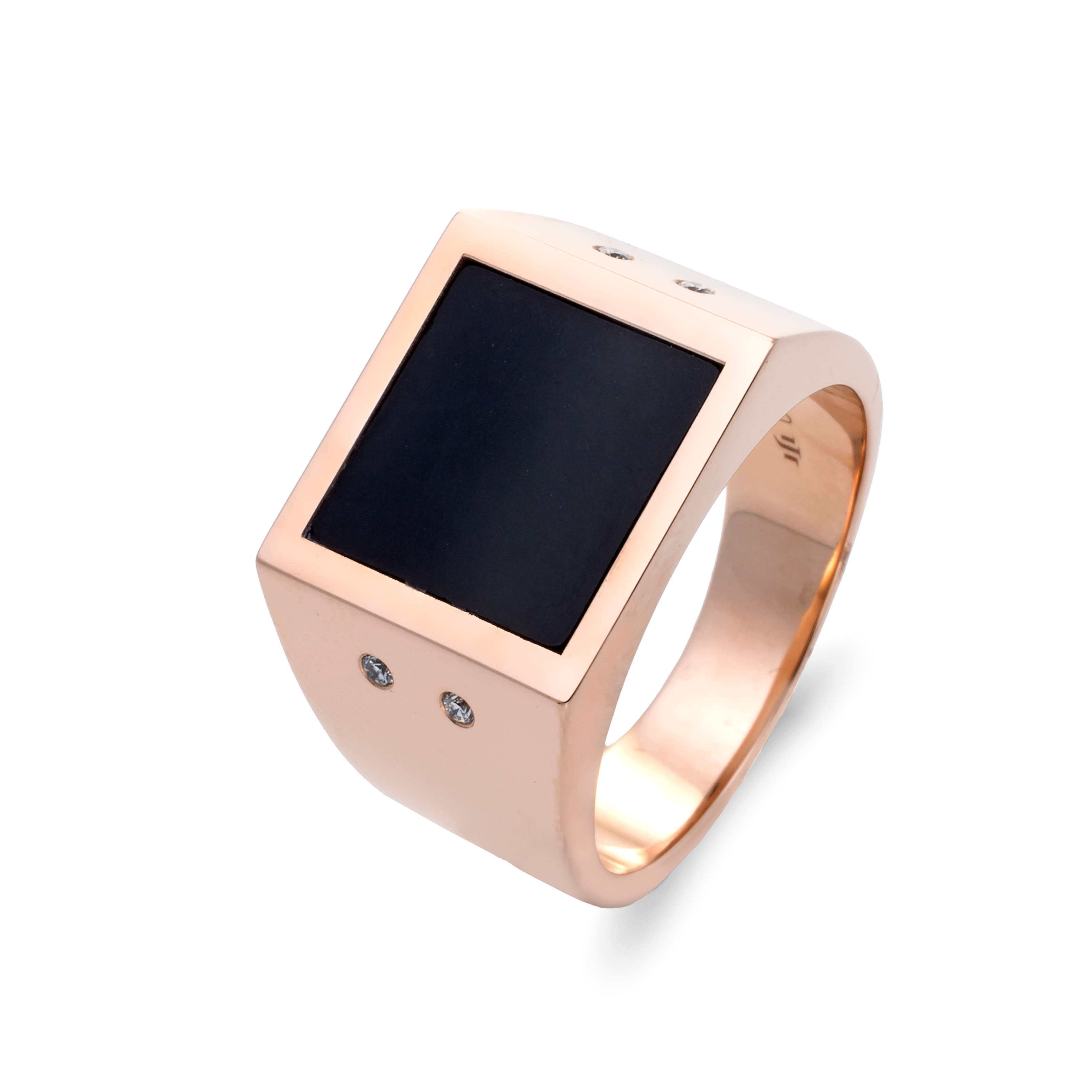Sortija oro rosa 18K, diamante color GH, claridad SI 0.06 ct, onix, 4 piedras
