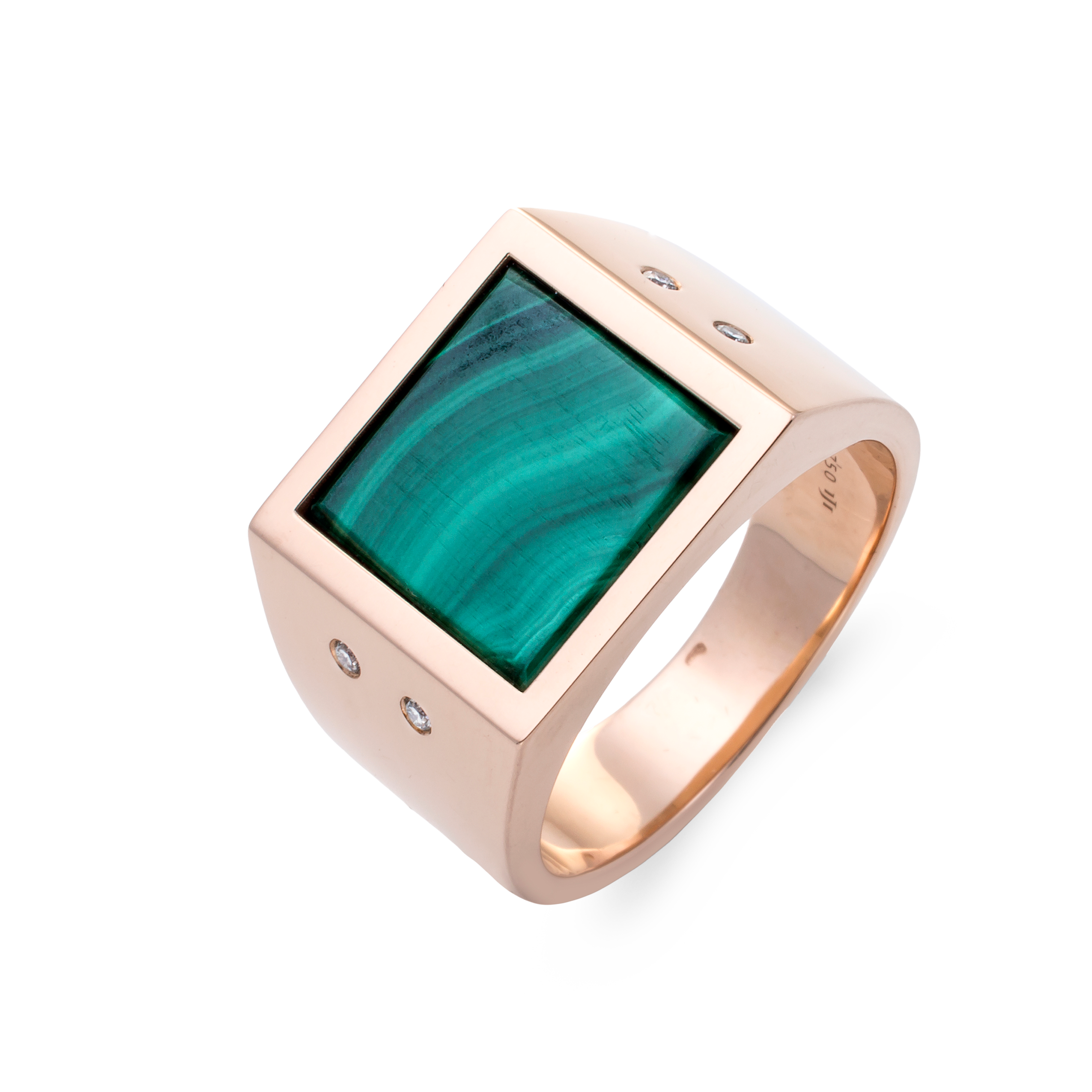 Sortija oro rosa 18K, diamante color GH, claridad SI 0.06 ct, malaquita, 4 piedras