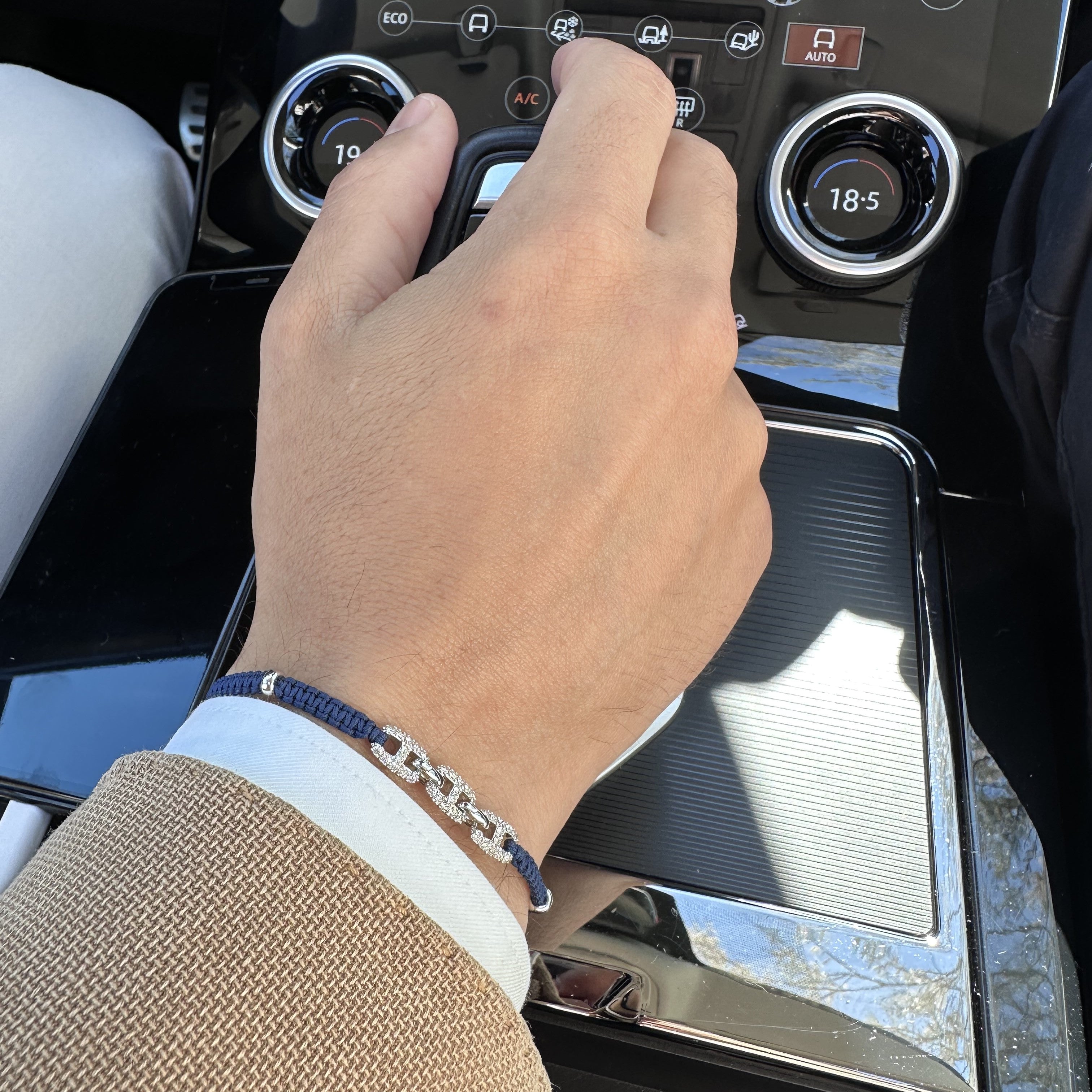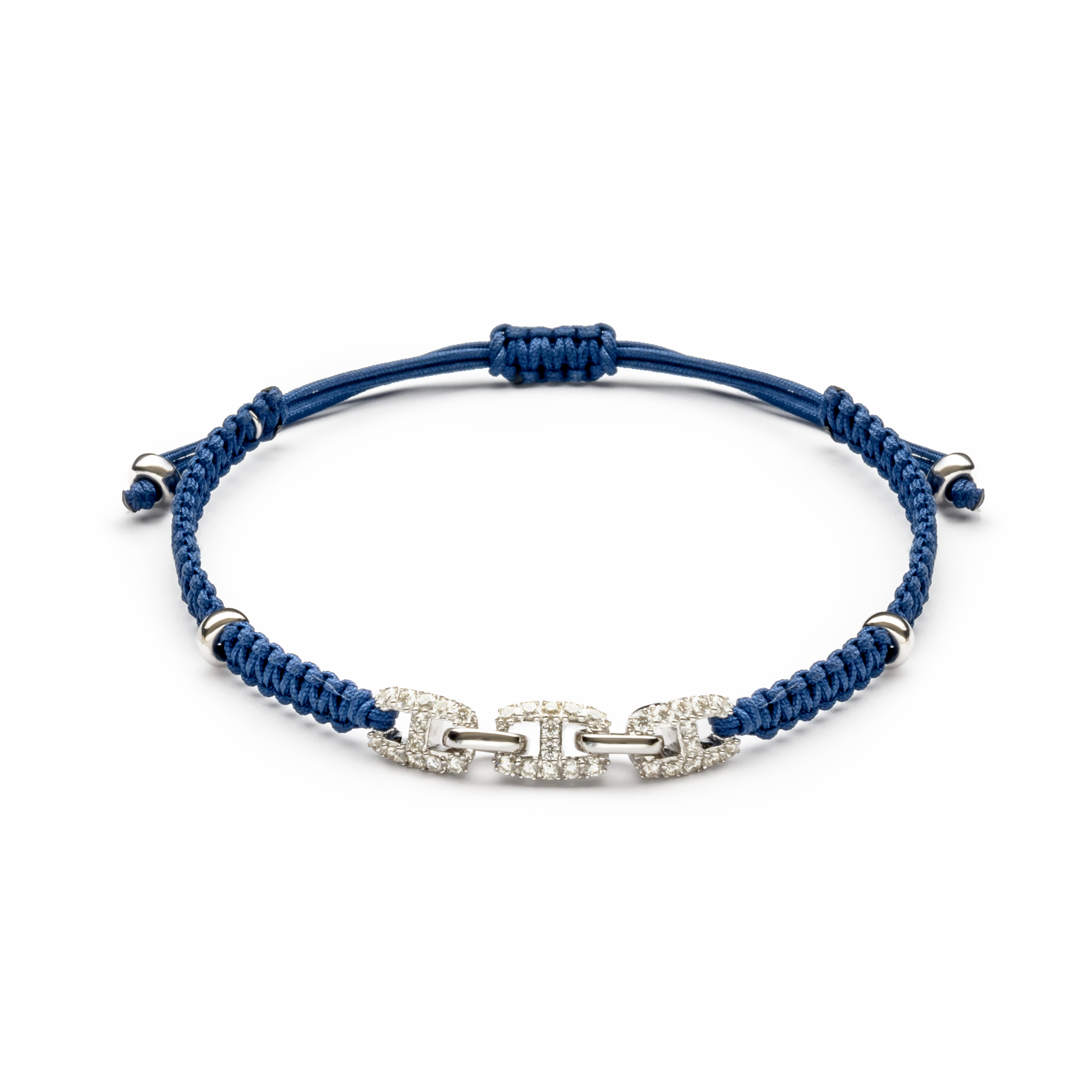 18K white gold bracelet, 36 stones, triple diamond link smooth wheel, Adjustable nylon cord from 15cm to 25cm