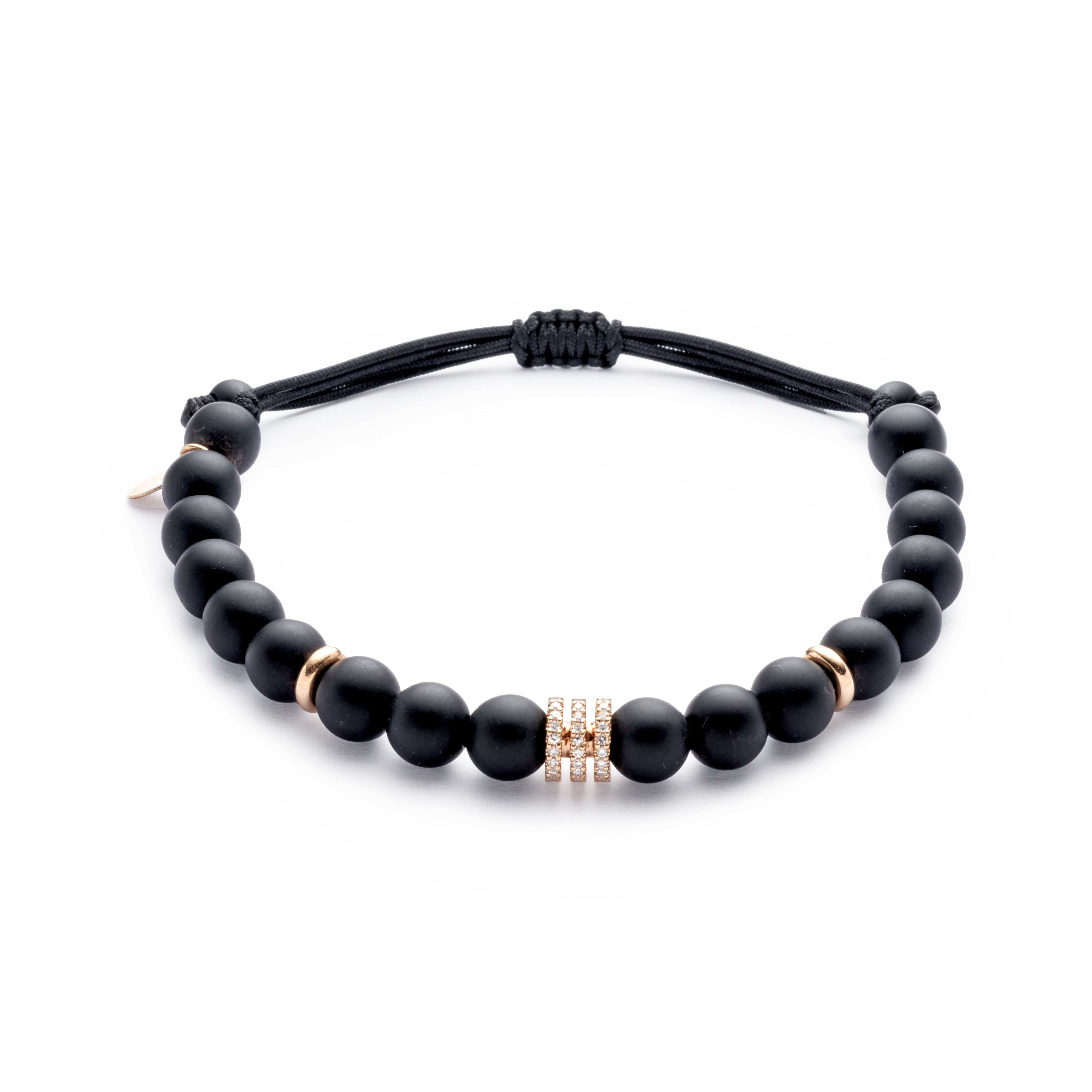 18K rose gold bracelet, onyx, 60 stones, triple 8/8 cut diamond wheel, Adjustable nylon cord from 15cm to 25cm