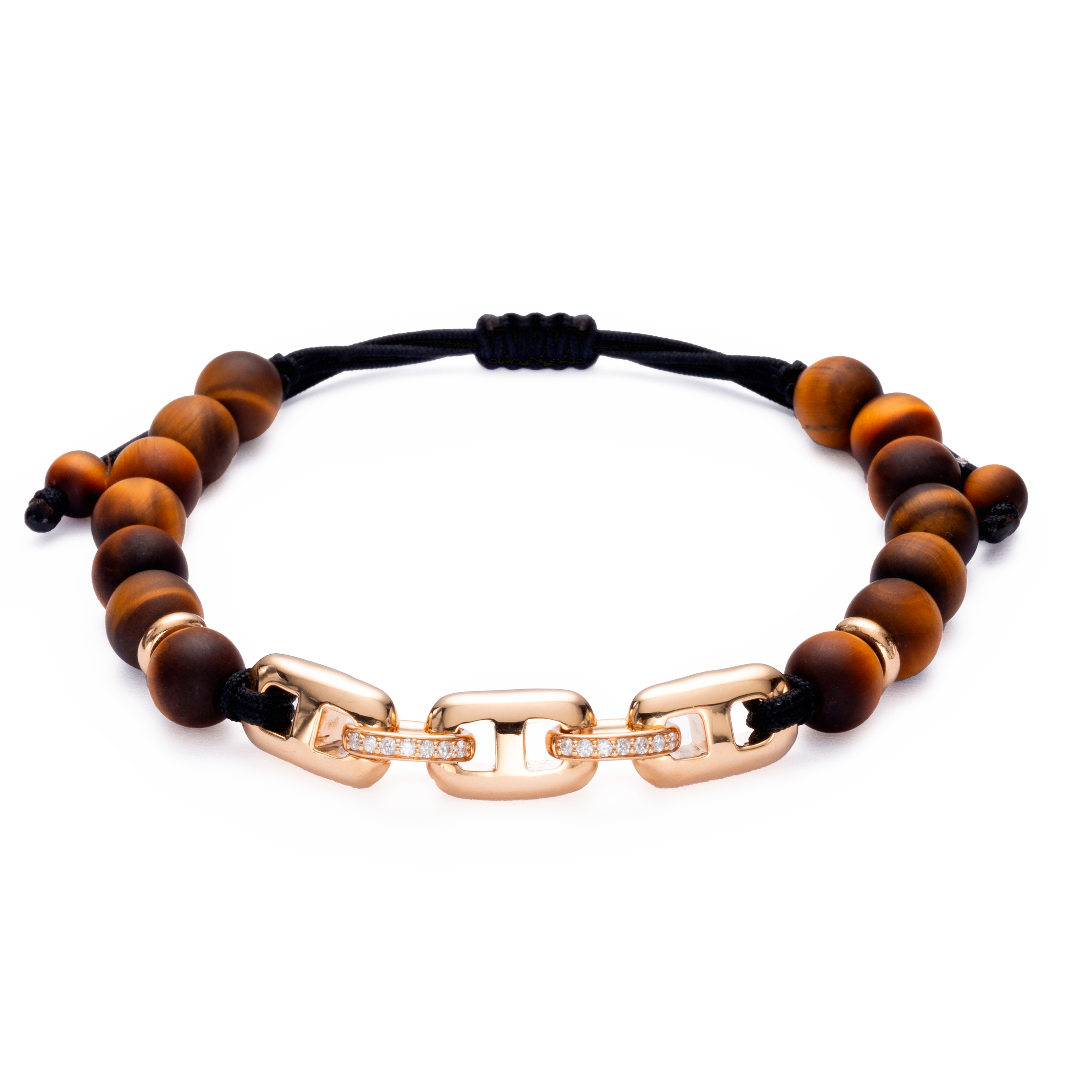 18K yellow gold bracelet, tiger eye, 30 stones, triple diamond link, Adjustable nylon cord from 15cm to 25cm