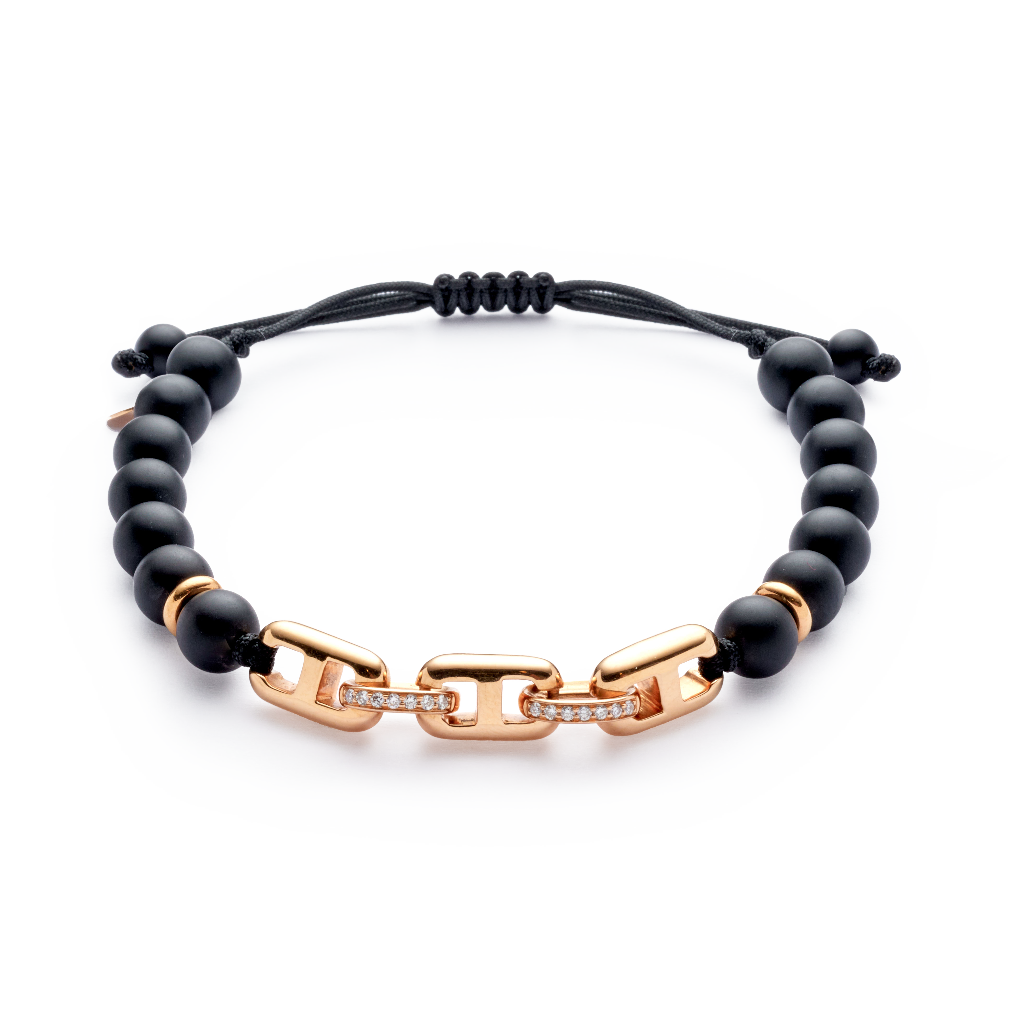 18K rose gold bracelet, onyx, 14 stones, triple diamond link, Adjustable nylon cord from 15cm to 25cm