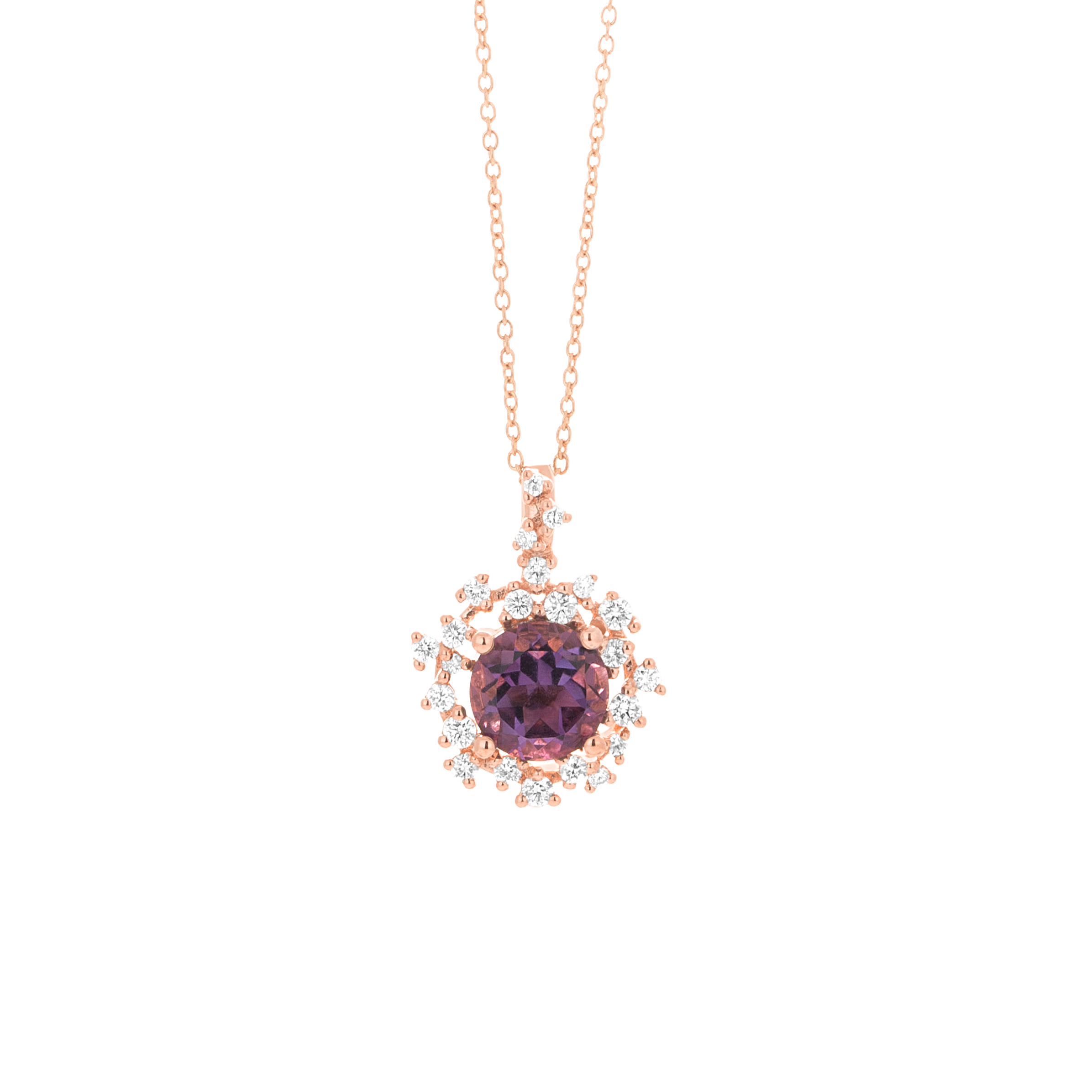 18K rose gold pendant, diamond color GH, clarity SI 0.18 ct, amethyst, 23 stones, 42cm rolo chain lobster clasp