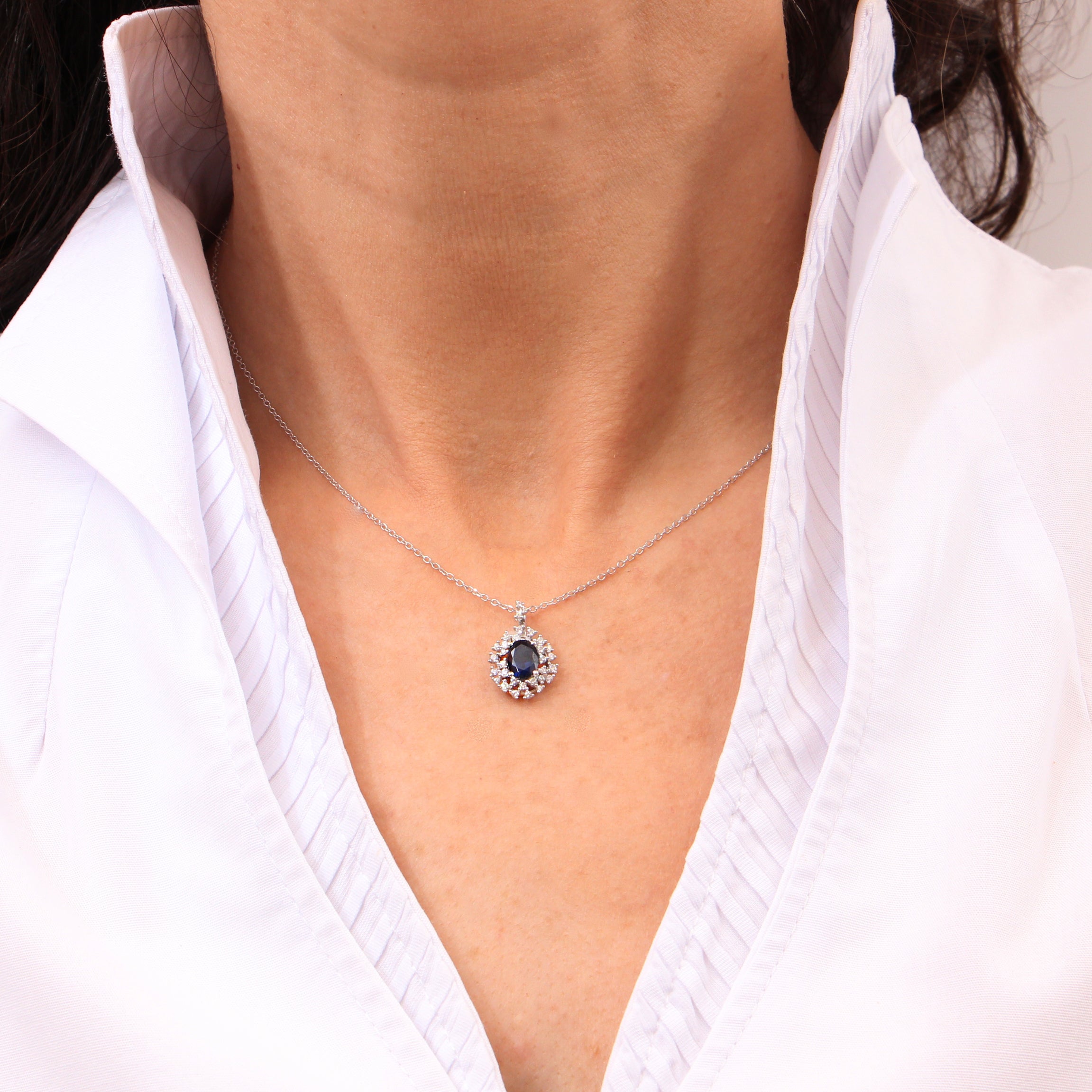 18K white gold pendant, diamond color GH, clarity SI 0.24 ct, sapphire, 32 stones, 42cm chain lobster clasp