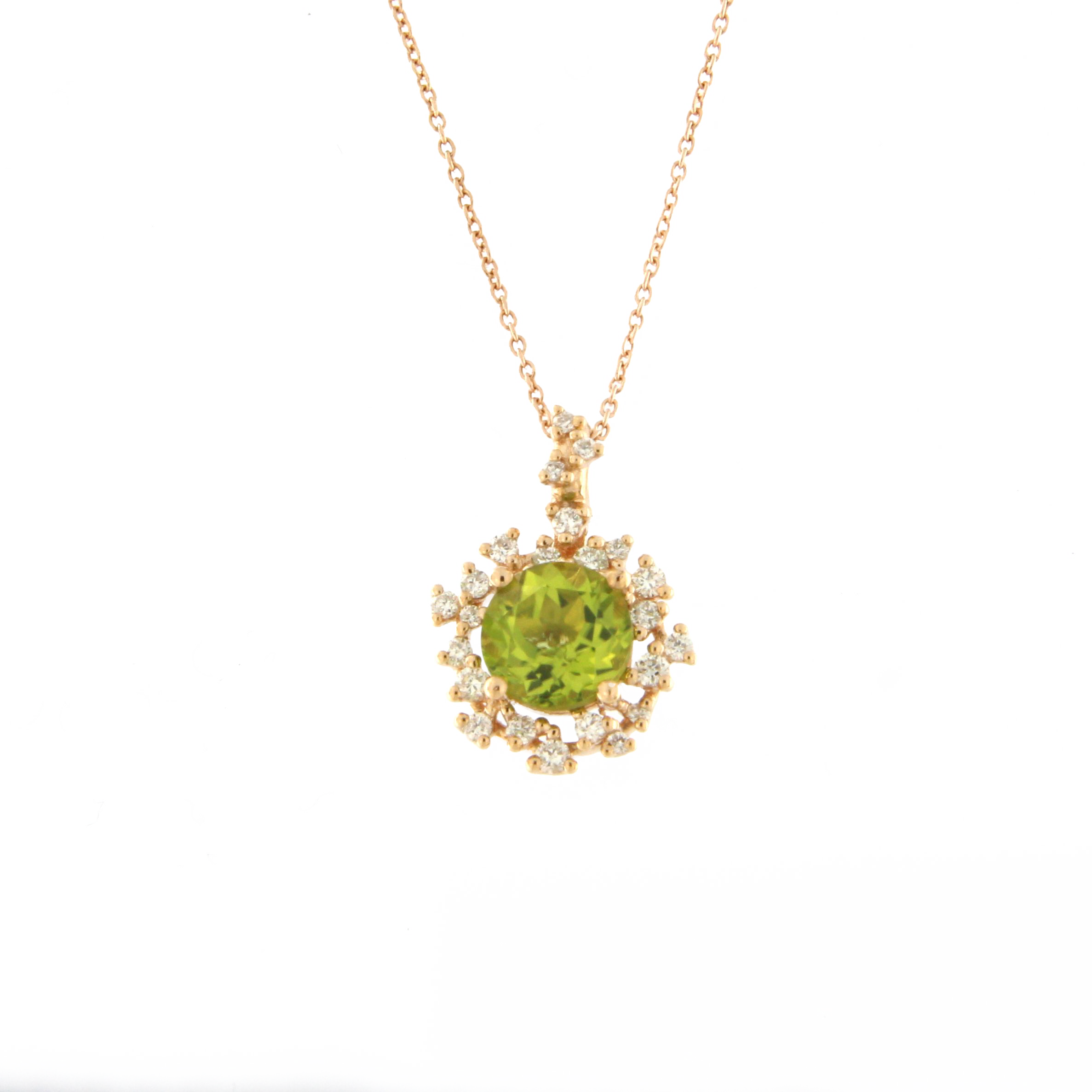 18K rose gold pendant, diamond color GH, clarity SI 0.17 ct, peridot, 23 stones, 42cm rolo chain lobster clasp