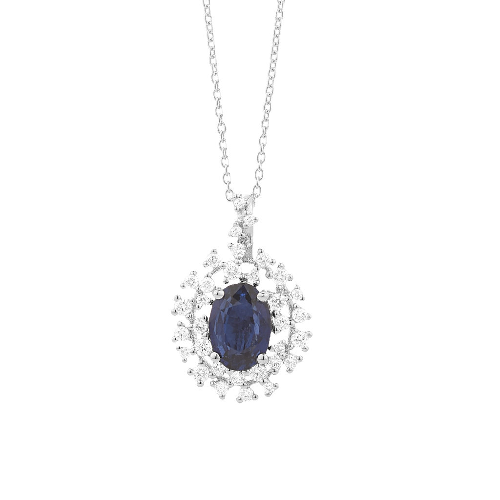 18K white gold pendant, diamond color GH, clarity SI 0.24 ct, sapphire, 32 stones, 42cm chain lobster clasp