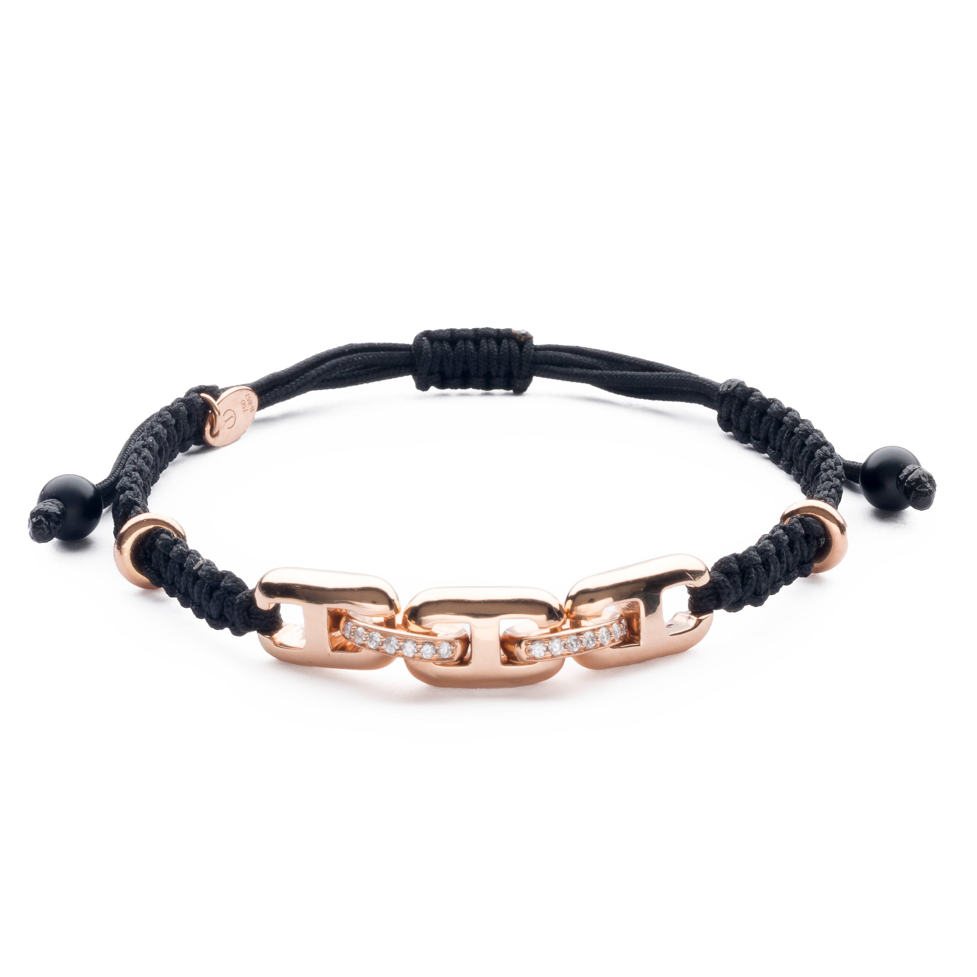 18K rose gold bracelet, onyx, 14 stones, triple diamond link, Adjustable nylon cord from 15cm to 25cm