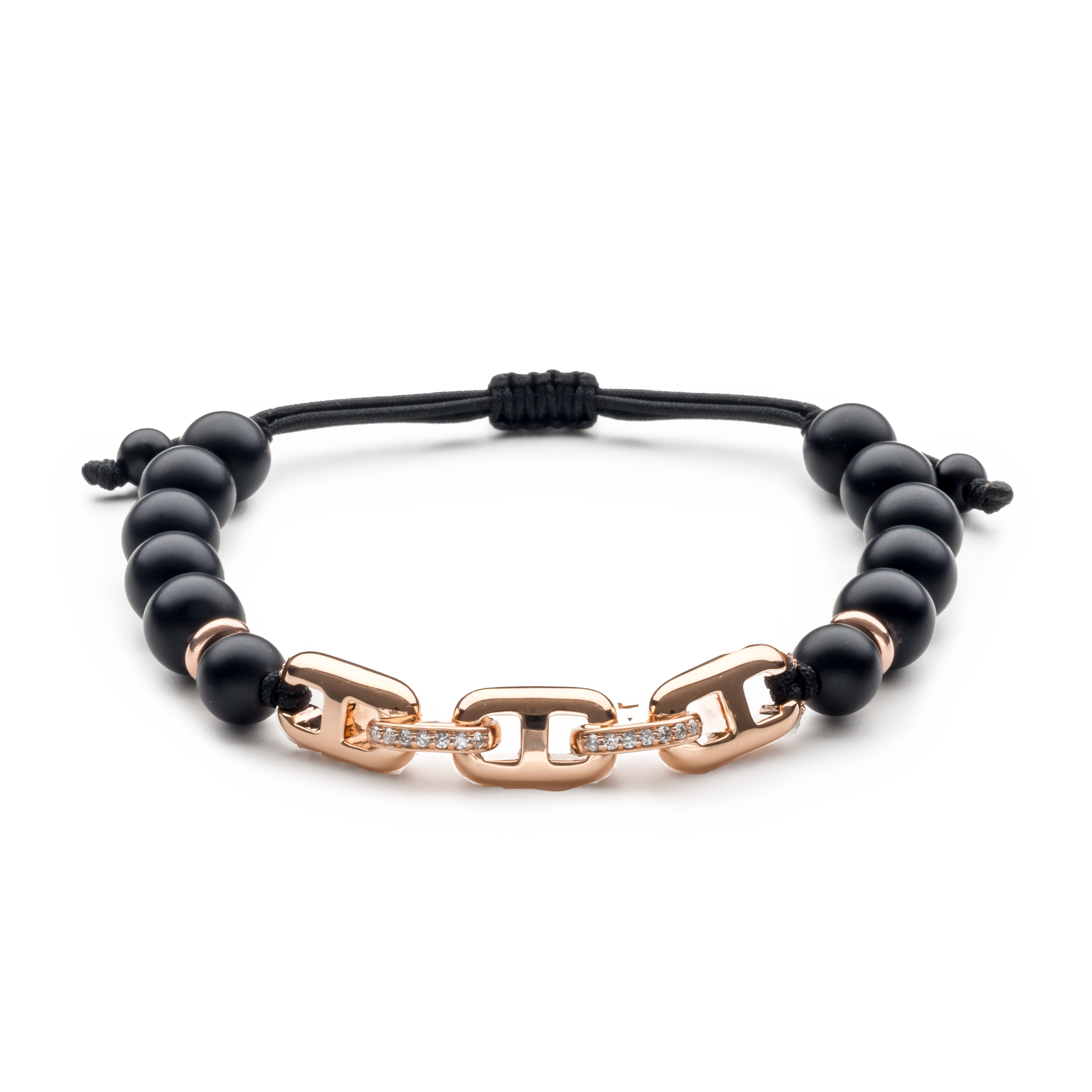 18K rose gold bracelet, onyx, 14 stones, triple diamond link, Adjustable nylon cord from 15cm to 25cm
