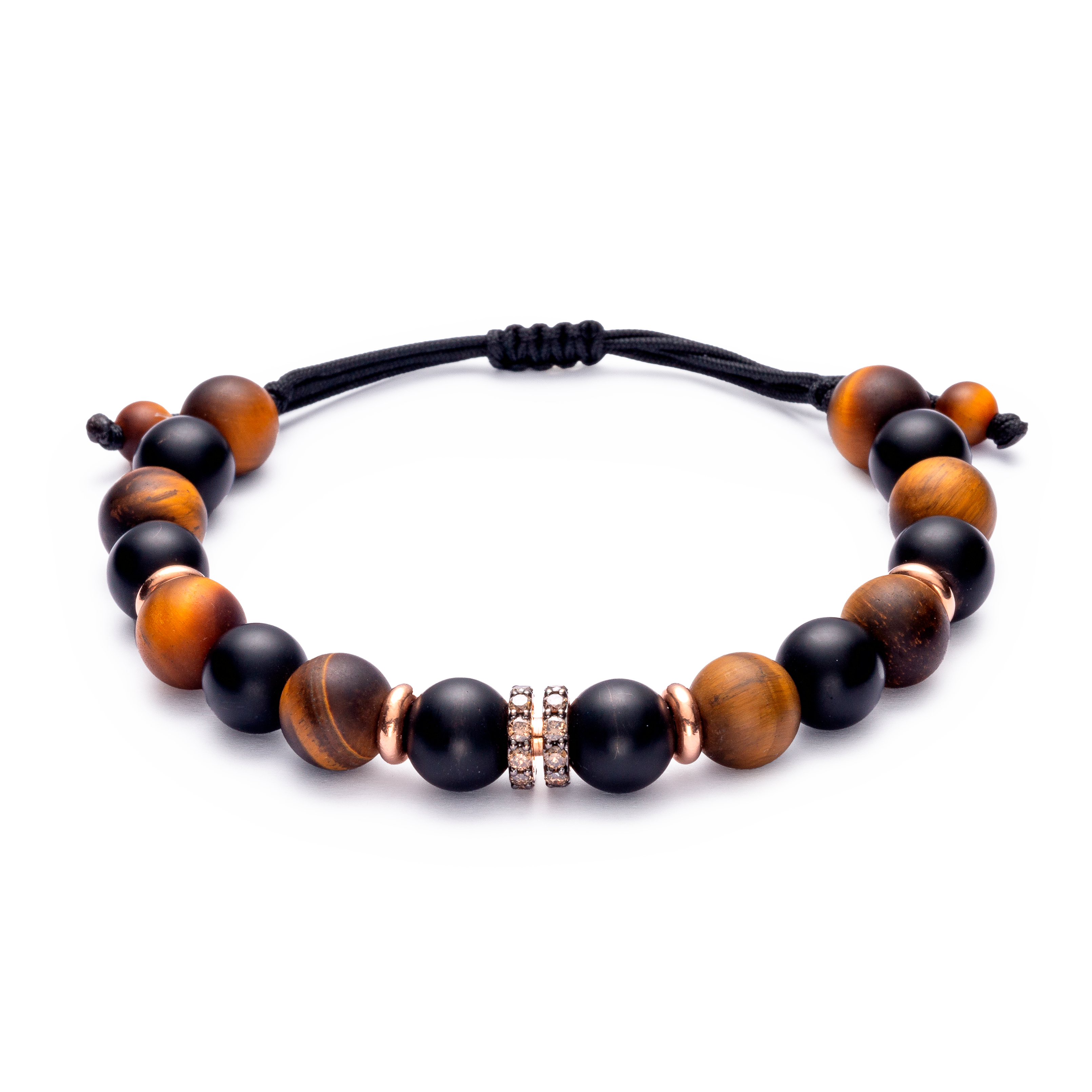 18K rose gold bracelet, tiger eye, 20 stones, double-wheel black diamond, Adjustable nylon cord from 15cm to 25cm