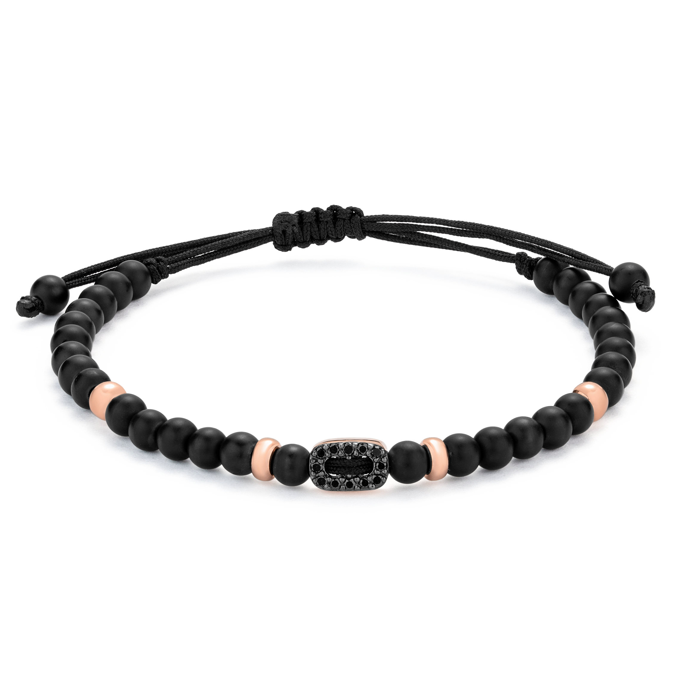 18K rose gold bracelet, onyx, 12 stones, black diamond link 4mm bead, Adjustable nylon cord from 15cm to 25cm