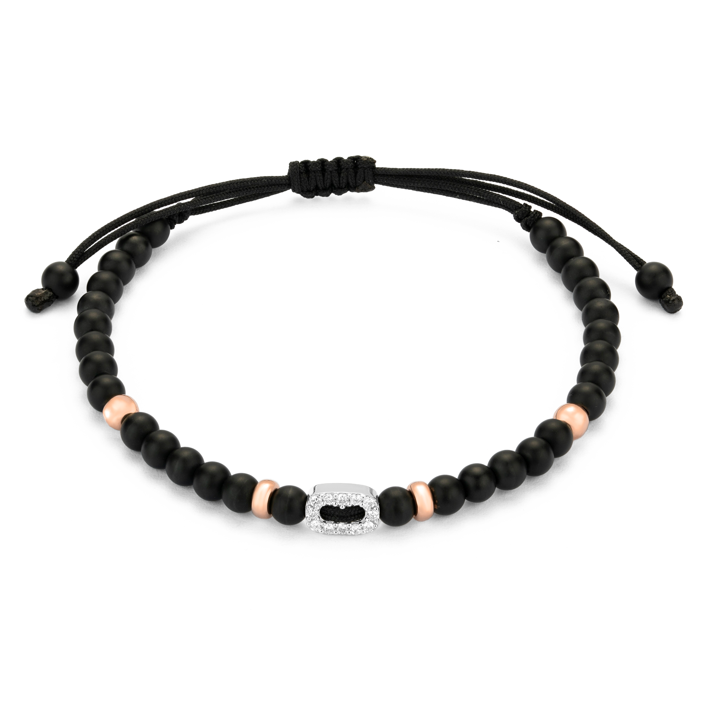 18K rose gold bracelet, onyx, 12 stones, diamond link 4mm bead, Adjustable nylon cord from 15cm to 25cm