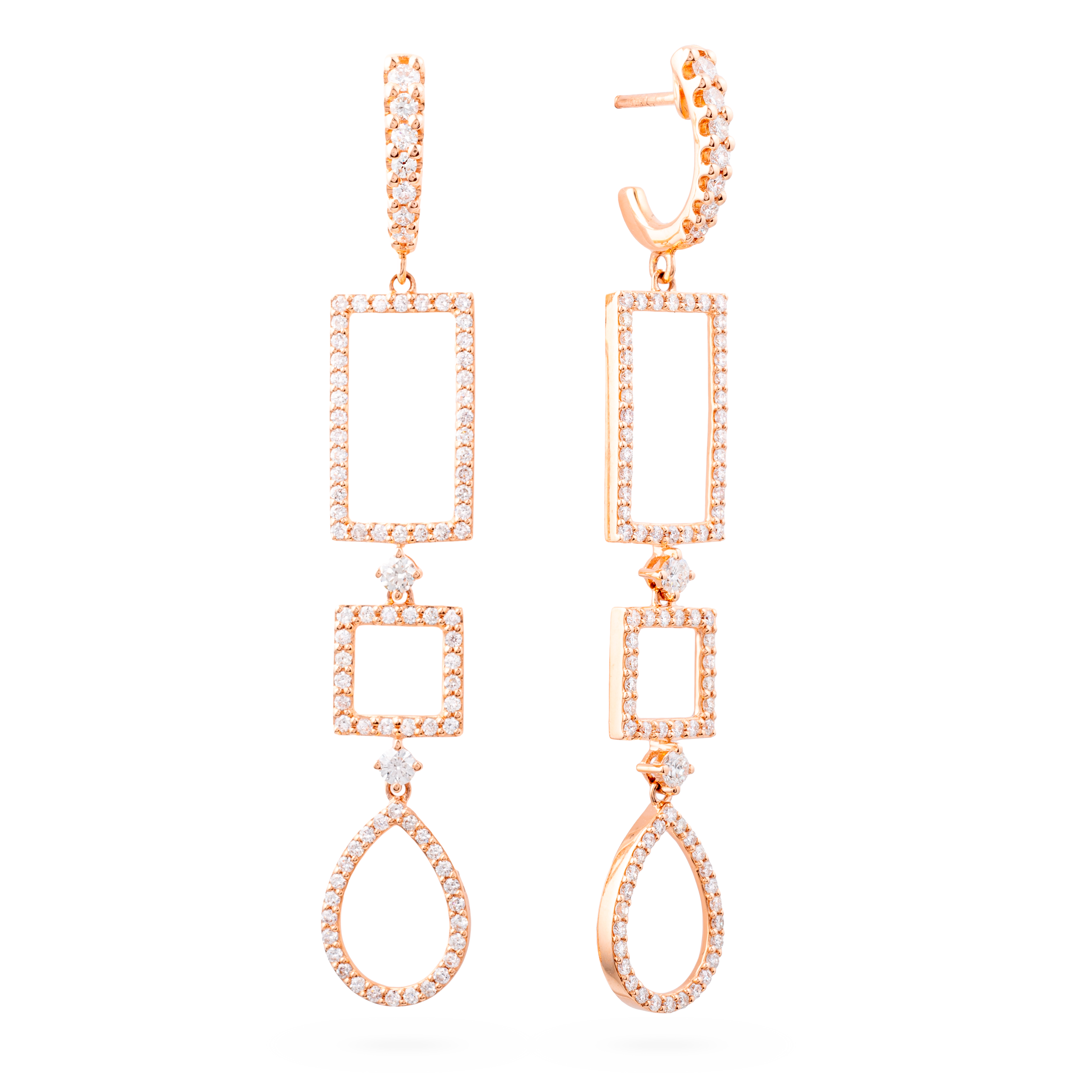 18K rose gold earring, diamond color GH, clarity SI 1.45 ct, 182 stones, pressure clasp