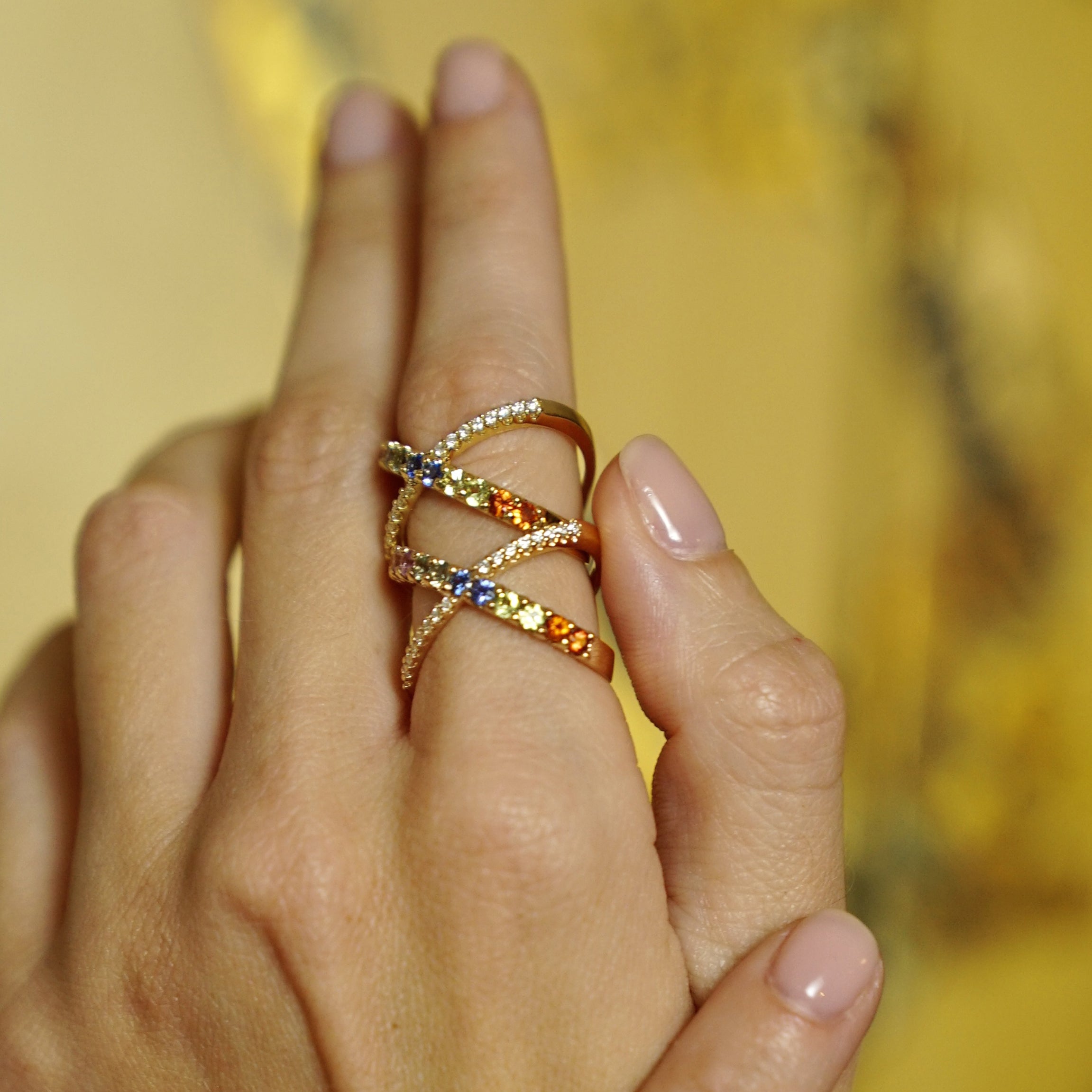 Collection Sunset Ring Gold, Diamond 0.16 ct, sapphire, crosses