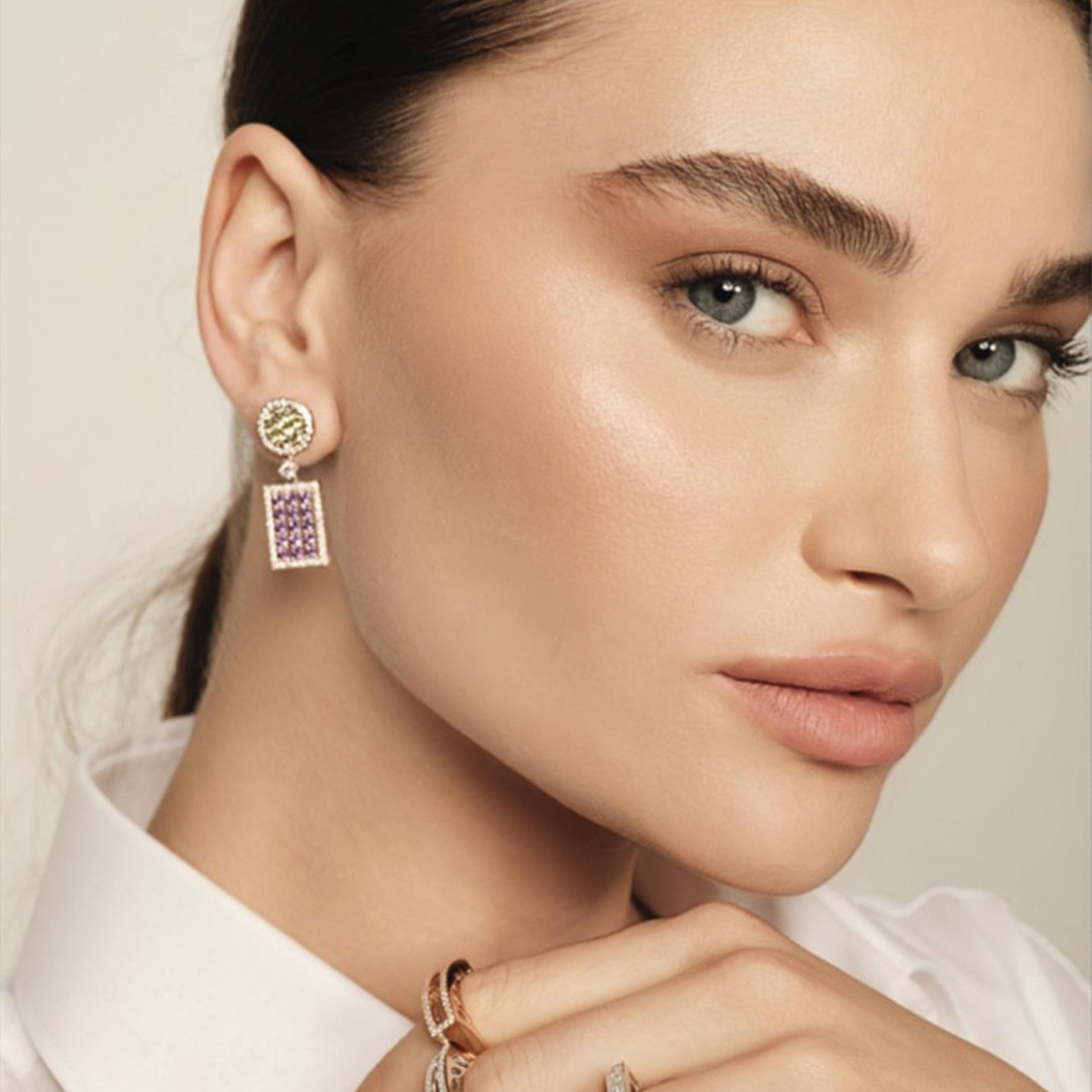Collection Brave Earring Gold, Diamond 1.13 ct, peridot and amethyst, dangle