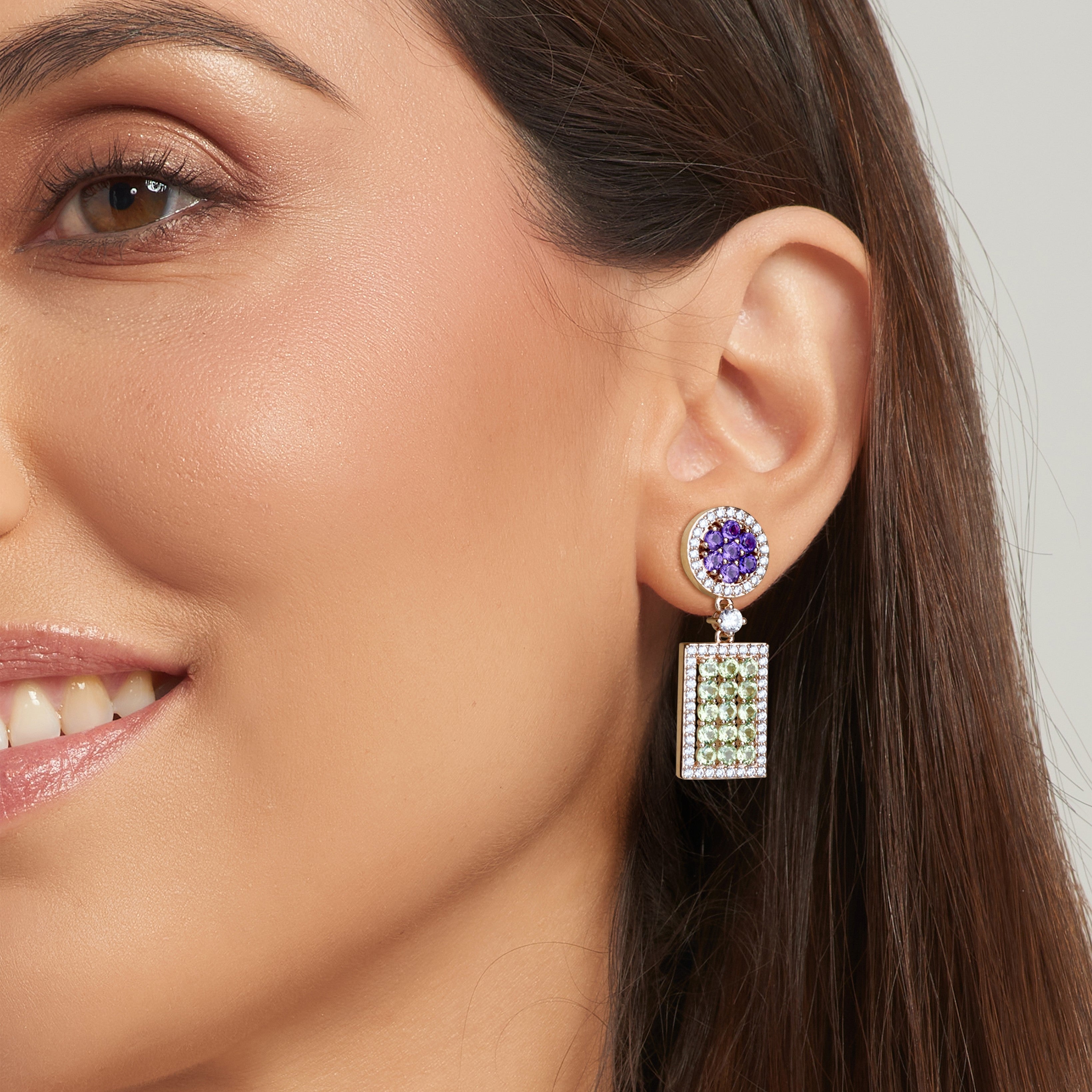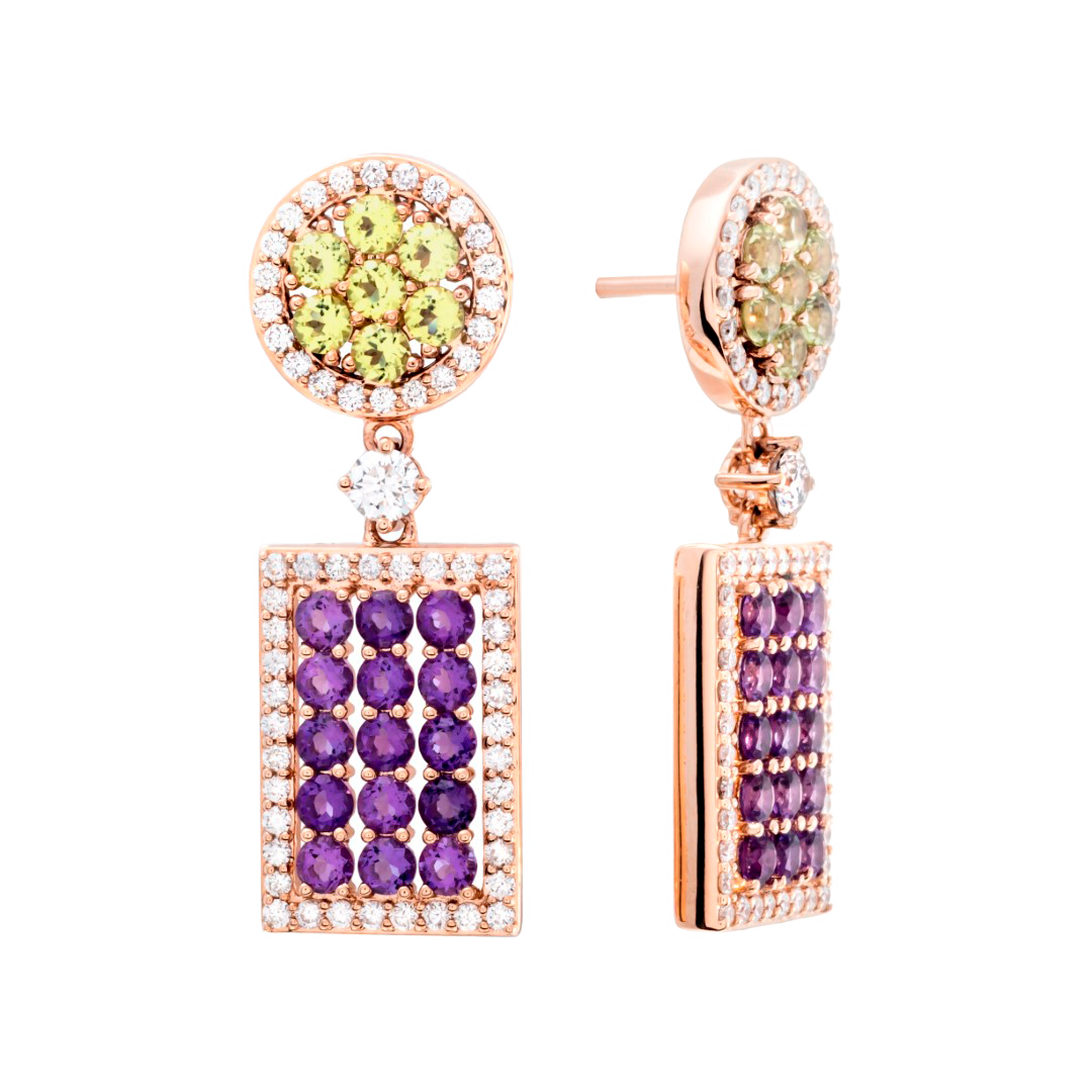 18K rose gold earring, diamond color GH, clarity SI 1.13 ct, peridot and amethyst, 118 stones, pressure clasp