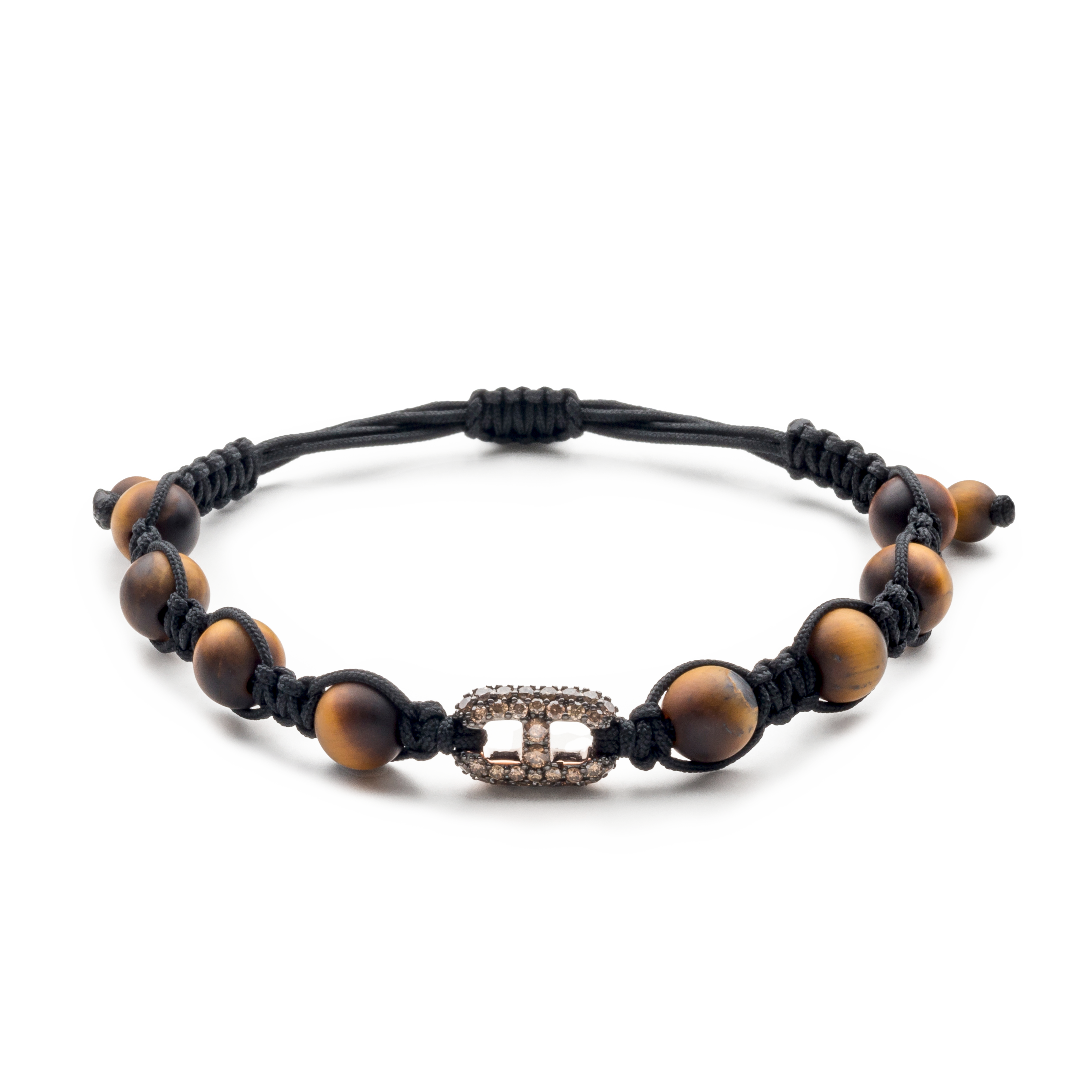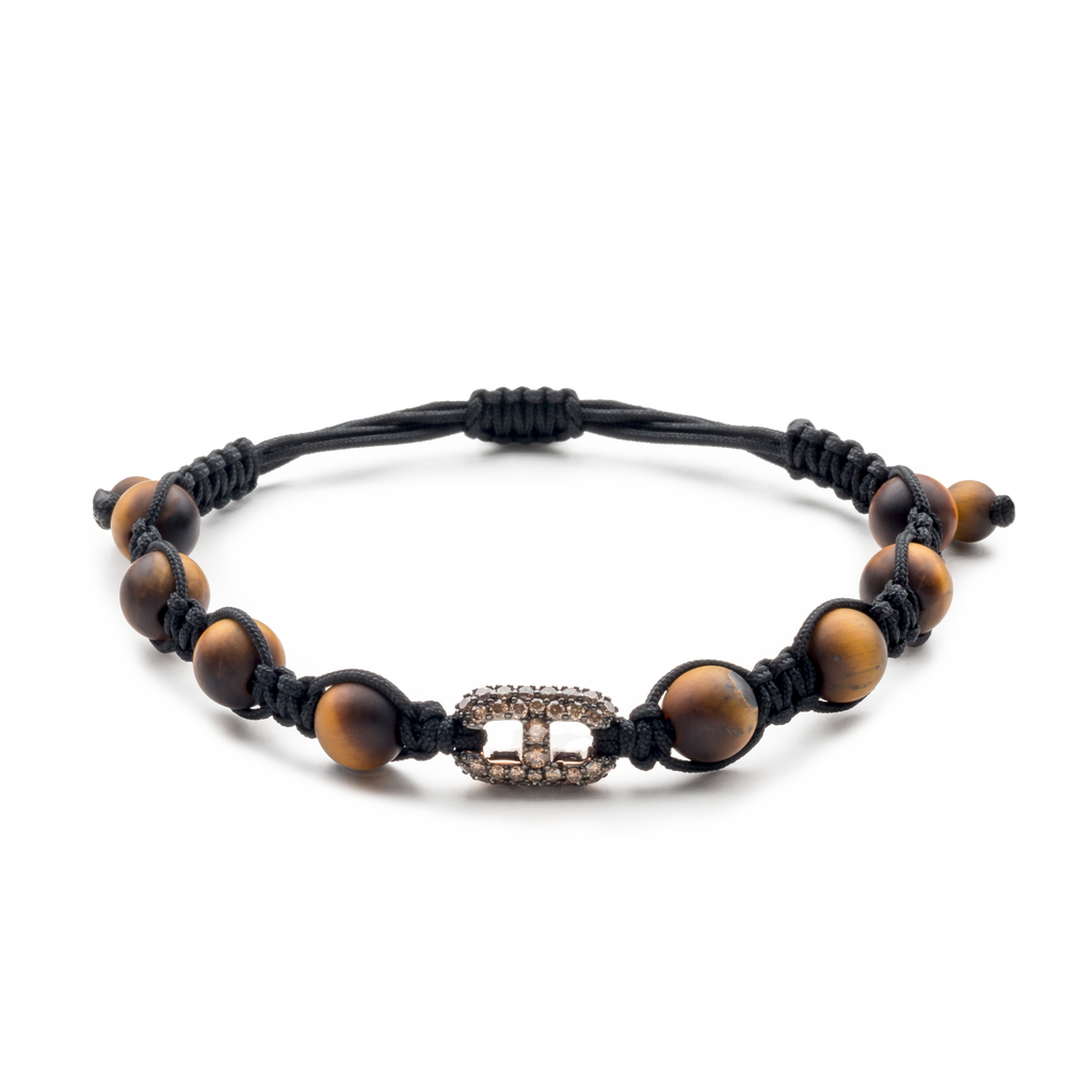 18K rose gold bracelet, tiger eye, 32 stones, large brown diamond link, Adjustable nylon cord from 15cm to 25cm