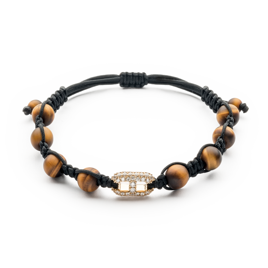 18K yellow gold bracelet, tiger eye, 32 stones, diamond link, Adjustable nylon cord from 15cm to 25cm