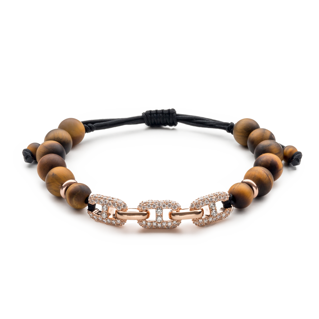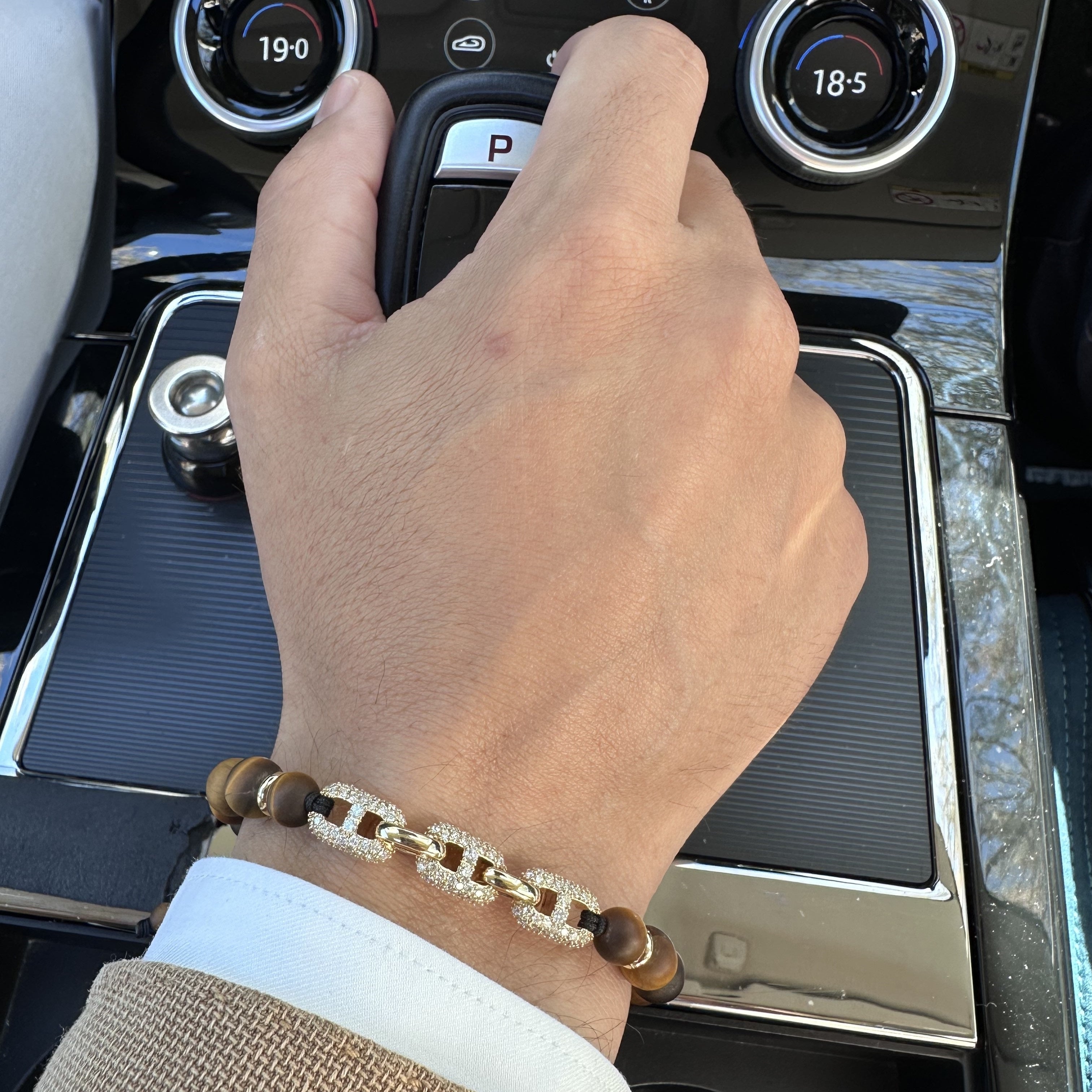 18K yellow gold bracelet, tiger eye, 96 stones, triple diamond link, Adjustable nylon cord from 15cm to 25cm